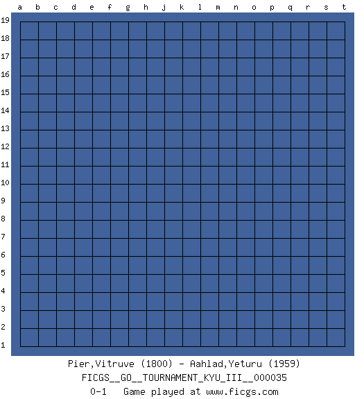 Last move : 0-1 2021 October 31 17:0:23 [Event "FICGS__GO__TOURNAMENT_KYU_III__000035"] [Site "FICGS"] [Date "2021.10.01"] [Round "1"] [Black "Pier,Vitruve"] [White "Aahlad,Yeturu"] [Result "0-1"] [Rating 1 "1800"] [Rating 2 "1959"] 0-1 This go game has been lost on time (started : 2021.10.01 11:12:11) Here are the names of the openings (joseki) played in the four corners : Player White won this Go (weiqi, baduk) game. Follow this game move after move (download)Go is not a blocking game, it's a game of action. (Pierre Audouard) . 'gn is not allowed in chess unless n is an integer between 1 and 8 inclusive, where 1 and 8 are to interpreted as the standard numerals standing for integers in the ordered real-closed field R, with the *canonical* ordering. (As opposed to, say, an integer in the domain Z[2+i*sqrt(5)] or an integer in some exotic Grothendieck topos). (Normajean Yates)