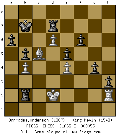 Last move : 0-1 2007 November 27 21:34:57 [Event "FICGS__CHESS__CLASS_E__000055"] [Site "FICGS"] [Date "2007.07.21"] [Round "1"] [White "Barradas,Anderson"] [Black "King,Kevin"] [Result "0-1"] [WhiteElo "1307"] [BlackElo "1548"] 1.e4 e5 2.Nf3 Nc6 3.Bb5 a6 4.Ba4 Nf6 5.d3 b5 6.Bb3 Be7 7.O-O d6 8.Nc3 O-O 9.Re1 Bg4 10.h3 Bh5 11.Nd5 Nxd5 12.Bxd5 Qd7 13.b3 Rab8 14.Rb1 Nd4 15.c3 Nxf3+ 16.gxf3 Qxh3 17.Re3 Bg5 18.Qf1 Qxf1+ 19.Kxf1 Bxe3 20.Bxe3 c5 21.f4 Rfc8 22.f5 Kf8 23.f4 f6 24.Rb2 Bf7 25.Rh2 h6 26.fxe5 dxe5 27.Be6 Bxe6 28.fxe6 Ke7 29.a3 Kxe6 30.b4 cxb4 31.Ba7 Rb7 32.Be3 Rxc3 33.axb4 Ra3 34.Rd2 Rd7 35.Ke2 h5 36.d4 h4 37.d5+ Kd6 38.Bc5+ Kc7 39.Kf2 Rh3 40.Kg2 Rg3+ 41.Kf2 g5 42.d6+ Kb7 43.Rd1 g4 44.Rh1 Rf3+ 45.Ke2 h3 46.Rh2 Rb3 47.Kd2 Rb2+ 0-1 Ruy Lopez : Anderssen variation Kingside Castling by player White (move 7) Kingside Castling by player Black (move 8) Player Black won this chess game. Follow this game move after move (download)I still hope to kill Fischer. (Boris Spassky) Schach ist gnadenlos. Du mußt bereit sein zu töten. (Nigel Short) El Ajedrez es en su esencia, un juego. En su forma, un arte. Y en su ejecución, una ciencia. (Baron Tassilo) Il vaut toujours mieux jouer un plan faux de façon logique que de n'avoir pas de plan du tout. (Victor Kortchnoï) Experience is the name we all give to our mistakes. (Oscar Wilde)