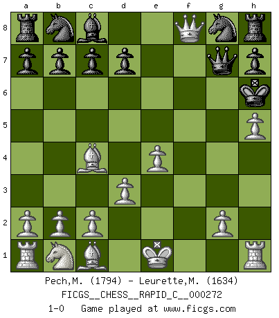 Last move : 1-0 2021 November 13 14:40:52 [Event "FICGS__CHESS__RAPID_C__000272"] [Site "FICGS"] [Date "2021.10.01"] [Round "1"] [White "Pech,Matej"] [Black "Leurette,Marc-Antoine"] [Result "1-0"] [WhiteElo "1794"] [BlackElo "1634"] 1.e4 e5 2.f4 exf4 3.Nf3 g5 4.h4 f6 5.Nxg5 fxg5 6.Qh5+ Ke7 7.Qxg5+ Ke8 8.Qh5+ Ke7 9.Qe5+ Kf7 10.Bc4+ Kg6 11.h5+ Kh6 12.Qxf4+ Qg5 13.Qxf8+ Qg7 14.d3 1-0 King's knight's gambit Player White won this chess game. Follow this game move after move (download)Help your pieces so they can help you. (Paul Morphy) Kritik überlasse ich den Spießern. Ich zeige nichts, wofür ich mich schämen muss. (Alexandra Kosteniuk) Alguna parte de un error es siempre correcto. (Savielly Tartakover) Des points faibles ou des trous dans la position de l'adversaire doivent être occupés par des pièces et non pas par des pions. (Siegbert Tarrasch) Cactus - It is depressed cucumber. (Ilmars Cirulis)