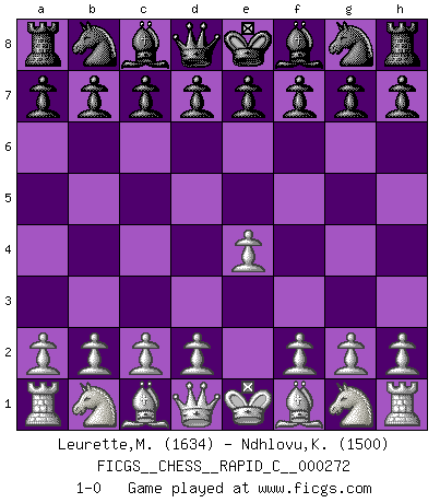 Last move : 1-0 2021 November 1 8:13:40 [Event "FICGS__CHESS__RAPID_C__000272"] [Site "FICGS"] [Date "2021.10.01"] [Round "1"] [White "Leurette,Marc-Antoine"] [Black "Ndhlovu,Kimble"] [Result "1-0"] [WhiteElo "1634"] [BlackElo "1500"] 1.e4 1-0 This chess game has been lost on time (started : 2021.10.01 19:51:54) King's pawn Opening Player White won this chess game. Follow this game move after move (download)Capture of the adverse King is the ultimate but not the first object of the game. (William Steinitz) Die Auseinandersetzung mit Karpow war politisch geprägt. Er stand für das kommunistische System, wurde von dessen Repräsentanten gehätschelt. Ich war der Oppositionelle. Jeder Schachweltmeister spiegelt auch die gesellschaftlichen Verhältnisse wider. Kramnik steht für die Börsen-Generation des Neuen Markts, ideologiefrei, zahlenfixiert. (Garry Kasparov) Yo he agregado estos principios a la ley: pongan los Caballos en acción antes de que los dos Alfiles sean desarrollados. (Emanuel Lasker) Un journaliste : 'Vous préférez avoir une dame de plus sur l'échiquier ou au lit ?' Boris Spassky : 'Ca dépend de la position.' Every vice is only an exaggeration of a necessary and virtuous function. (Ralph Waldo Emerson, Journals 1936)