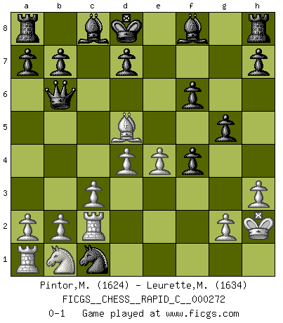 Last move : 0-1 2021 October 7 19:4:33 [Event "FICGS__CHESS__RAPID_C__000272"] [Site "FICGS"] [Date "2021.10.01"] [Round "1"] [White "Pintor,Manuel"] [Black "Leurette,Marc-Antoine"] [Result "0-1"] [WhiteElo "1624"] [BlackElo "1634"] 1.e4 e5 2.f4 exf4 3.Nf3 g5 4.Bc4 f6 5.Nd4 Qe7 6.O-O Qc5 7.Qh5+ Kd8 8.Qf7 Qxd4+ 9.Kh1 Nh6 10.Qd5 Nc6 11.d3 Qb6 12.c3 Ng4 13.h3 Nf2+ 14.Kh2 Ne5 15.d4 c6 16.Rxf2 cxd5 17.Bxd5 Nd3 18.Rc2 Nxc1 0-1 KGA : King's knight's gambit Kingside Castling by player White (move 6) Player Black won this chess game. Follow this game move after move (download)A big shock; the best chess player in history has passed away. (Lajos Portisch, about Bobby Fischer's death) Ich bin der einzige Schachspieler, der sich während der Vorbereitungen zum Turnier verletzt hat. (Woody Allen) Nada excita más a Grandes Maestros aburridos que una novedad teórica. (Dominic Lawson) Karpov est une pièce de musée. (Garry Kasparov) Those who make the worst use of their time are the first to complain of its brevity. (Jean de la Bruyere)