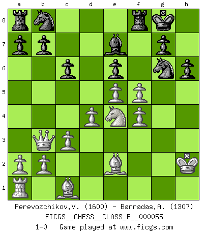 Last move : 1-0 2007 August 17 22:26:53 [Event "FICGS__CHESS__CLASS_E__000055"] [Site "FICGS"] [Date "2007.07.21"] [Round "1"] [White "Perevozchikov,Vjacheslav"] [Black "Barradas,Anderson"] [Result "1-0"] [WhiteElo "1600"] [BlackElo "1307"] 1.e4 c6 2.d4 d5 3.e5 Bf5 4.Nf3 e6 5.Be2 Ne7 6.Nc3 Ng6 7.h3 Bb4 8.O-O O-O 9.g4 Be4 10.Nxe4 dxe4 11.Ng5 h6 12.Nxe4 Qh4 13.f4 Qxh3 14.c3 Be7 15.Rf2 Nh4 16.Rh2 Qxh2+ 17.Kxh2 f5 18.Qb3 Ng6 19.gxf5 1-0 Caro-Kann : Advance variation Kingside Castling by player White (move 8) Kingside Castling by player Black (move 8) Player White won this chess game. Follow this game move after move (download)When in doubt... play Chess ! (Tevis) Bogoljubow: Matt in vier Zügen! Tartakower: Ich verbitte mir jede Belästigung! (Savielly Grigorievitsch Tartakower) Solo puedes ser bueno en el Ajedrez si amas al juego. (Bobby Fischer) On croit qu'il y a plus de mauvais joueurs que de bons joueurs, c'est faux : Il y a autant de joueurs qui gagnent que de joueurs qui perdent. (Philippe Geluck) Dave, my mind is going. I can feel it. (HAL 9000 in 2001, a space odyssey)