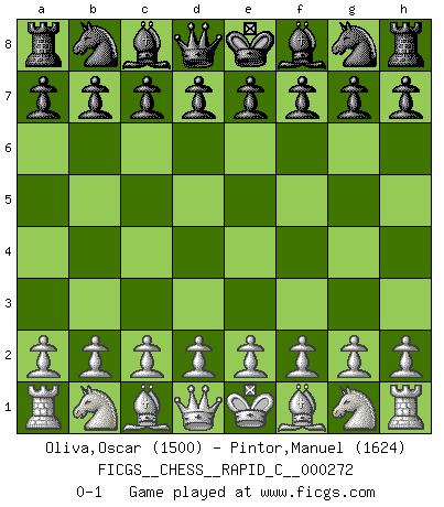 Last move : 0-1 2021 November 1 8:13:40 [Event "FICGS__CHESS__RAPID_C__000272"] [Site "FICGS"] [Date "2021.10.01"] [Round "1"] [White "Oliva,Oscar"] [Black "Pintor,Manuel"] [Result "0-1"] [WhiteElo "1500"] [BlackElo "1624"] 0-1 This chess game has been lost on time (started : 2021.10.01 19:51:54) Player Black won this chess game. Follow this game move after move (download)At this time Fischer is simply a level above all the best Chessplayers in the world. (John Jacobs) Kasparov ist eine Art Monster mit hundert Augen, denen auch nicht das Geringste entgeht. (Tony Miles) Una buena memoria, concentración, imaginación y una fuerte voluntad, se requiere para llegar a ser un buen jugador. (Bobby Fischer) Psychologiquement, tu dois avoir confiance en toi même, mais cette confiance doit être basée sur des faits. (Robert Fischer) Do you know these so called Volunteers don't even get paid! (Simpsons)