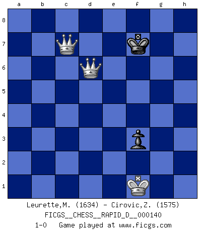 Last move : 1-0 2021 December 30 13:36:33 [Event "FICGS__CHESS__RAPID_D__000140"] [Site "FICGS"] [Date "2021.10.06"] [Round "1"] [White "Leurette,Marc-Antoine"] [Black "Cirovic,Zeljko"] [Result "1-0"] [WhiteElo "1634"] [BlackElo "1575"] 1.e4 e5 2.Nf3 Nc6 3.Bc4 d6 4.d4 exd4 5.Nxd4 Nxd4 6.Qxd4 Be6 7.O-O Bxc4 8.Qxc4 Nf6 9.Nc3 Be7 10.Qb5+ Qd7 11.Qxb7 O-O 12.Nd5 Nxd5 13.exd5 Rfb8 14.Qa6 Bf6 15.Rb1 Qf5 16.Qc4 Be5 17.b3 a5 18.Bd2 Qh5 19.h3 h6 20.Rbe1 a4 21.bxa4 Ra7 22.a5 g5 23.Bc3 Rba8 24.Bxe5 dxe5 25.Rxe5 Rxa5 26.f4 Ra4 27.Qxc7 Rxa2 28.Qc6 R8a6 29.Re8+ Kg7 30.Qc5 g4 31.Qd4+ Rf6 32.d6 gxh3 33.d7 hxg2 34.Qxf6+ Kxf6 35.d8Q+ Kf5 36.Re5+ Kg4 37.Rxh5 gxf1Q+ 38.Kxf1 Kxh5 39.Qd5+ f5 40.Qxa2 Kg4 41.c4 Kxf4 42.Qd2+ Kf3 43.c5 f4 44.c6 h5 45.c7 h4 46.c8Q h3 47.Qxh3+ Ke4 48.Qh3d3+ Ke5 49.Qd2c3+ Ke6 50.Qc5 Kf7 51.Qd3d6 f3 52.Qc5c7+ 1-0 This chess game has been lost on time (started : 2021.10.06 21:9:41) King's pawn game Kingside Castling by player White (move 7) Kingside Castling by player Black (move 11) Promotion Queen by player White (move 35) Promotion Queen by player Black (move 37) 10 pieces endgame at move 37 : White KQRPP , Black KQRPP WHITE : King + 1 Queen 1 Rook 2 Pawns BLACK : King + 1 Queen 1 Rook 2 Pawns 9 pieces endgame at move 38 : White KQRPP , Black KRPP WHITE : King + 1 Queen 1 Rook 2 Pawns BLACK : King + 1 Rook 2 Pawns 8 pieces endgame at move 38 : White KQPP , Black KRPP WHITE : King + 1 Queen 2 Pawns BLACK : King + 1 Rook 2 Pawns 7 pieces endgame at move 40 : White KQPP , Black KPP WHITE : King + 1 Queen 2 Pawns BLACK : King + 2 Pawns 6 pieces endgame at move 41 : White KQP , Black KPP WHITE : King + 1 Queen 1 Pawn BLACK : King + 2 Pawns Promotion Queen by player White (move 46) 5 pieces endgame at move 47 : White KQQ , Black KP WHITE : King + 2 Queens BLACK : King + 1 Pawn Player White won this chess game. Follow this game move after move (download)When you see a good move, look for a better one. (Emanuel Lasker) Der Freibauer hat für mich eine Seele, genau wie der Mensch, Wünsche, die unerkannt in ihm schlummern, und Befürchtungen, von deren Existenz er selbst kaum ahnt. (Aaron Nimzowitsch) En el Ajedrez, cuando menos, el valiente hereda la tierra. (Edmar Mednis) Aidez vos pièces, elles vous aideront. (Paul Morphy) There are two kinds of tragedy in this world, one is not getting what you want and the other is getting. (Lord of war)