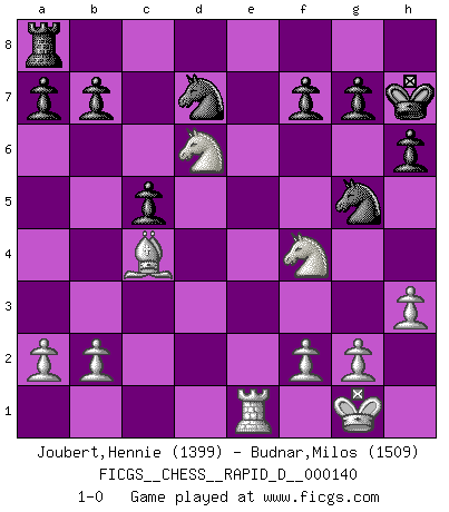 Last move : 1-0 2021 November 25 20:43:16 [Event "FICGS__CHESS__RAPID_D__000140"] [Site "FICGS"] [Date "2021.10.06"] [Round "1"] [White "Joubert,Hennie"] [Black "Budnar,Milos"] [Result "1-0"] [WhiteElo "1399"] [BlackElo "1509"] 1.e4 e5 2.Bc4 Nf6 3.d4 exd4 4.Nf3 Nxe4 5.Qxd4 Nf6 6.O-O Be7 7.Re1 O-O 8.Bf4 d6 9.Nc3 c5 10.Qe3 Re8 11.Rad1 h6 12.h3 Bf5 13.Nb5 Bxc2 14.Rc1 Bg6 15.Rcd1 Ne4 16.Ne5 Nd7 17.Nxg6 Bg5 18.Bxg5 Qxg5 19.Qxg5 Nxg5 20.Nxd6 Rxe1 21.Rxe1 Kh7 22.Nf4 1-0 Bishop's Opening : Urusov gambit Kingside Castling by player White (move 6) Kingside Castling by player Black (move 7) Player White won this chess game. Follow this game move after move (download)You must take your opponent into a deep dark forest where 2+2=5, and the path leading out is only wide enough for one. (Mikhail Tal) Ich tröste mich mit dem Vergnügen, daß Schachfans, Zuschauer und Leser glücklich sind, wenn ein Großmeister etwas riskiert, statt nur Klötzchen zu schieben. (Mikhail Nekhemyevich Tal) La caracteristica mas importante en la posición del Ajedrez es la actividad de las piezas. Esto es absolutamente fundamental en todas las fases del juego: Apertura, Juego Medio y especialmente Finales. La limitación primordial en la actividad de una pieza, es la estructuración de los Peones. (Michael Stean) Assurément je connaissais par expérience le mystérieux attrait de ce jeu royal, le seul entre tous les jeux inventés par les hommes qui échappe souverainement à la tyrannie du hasard, le seul où l'on ne doive sa victoire qu'à son intelligence ou plutôt à une certaine forme d'intelligence. Mais n'est-ce pas déjà le limiter injurieusement que d'appeler les échecs un jeu ? N'est-ce pas une science, un art ou quelque chose qui, comme le cercueil de Mahomet entre ciel et terre, est suspendu entre l'un et l'autre, et qui réunit un nombre incroyable de contraires ? [...] C'est une pensée qui ne mène à rien, une mathématique qui n'établit rien, un art qui ne laisse pas d'uvre, une architecture sans matière; et il l'a prouvé néanmoins qu'il était plus durable, à sa manière, que les livres ou que tout autre monument, ce jeu unique qui appartient à tous les peuples et à tous les temps, et dont personne ne sait quel dieu en fit don à la terre pour tuer l'ennui, pour aiguiser l'esprit et stimuler l'âme. Où commence-t-il, où finit-il ? (Stefan Zweig) Creativity is allowing yourself to make mistakes. Art is knowing which ones to keep. (Scott Adams)