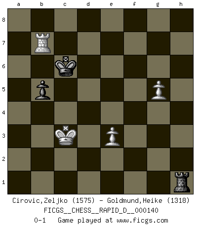 Last move : 0-1 2022 February 8 15:38:27 [Event "FICGS__CHESS__RAPID_D__000140"] [Site "FICGS"] [Date "2021.10.06"] [Round "1"] [White "Cirovic,Zeljko"] [Black "Goldmund,Heike"] [Result "0-1"] [WhiteElo "1575"] [BlackElo "1318"] 1.e4 d5 2.exd5 Qxd5 3.Qf3 Qe5+ 4.Qe3 Qxe3+ 5.dxe3 Nf6 6.Nc3 Bf5 7.Bd3 Bxd3 8.cxd3 e6 9.Nf3 Bb4 10.Bd2 Nbd7 11.Ne4 Bxd2+ 12.Kxd2 Nxe4+ 13.dxe4 Nc5 14.e5 O-O-O 15.Kc2 Ne4 16.Rhf1 Rd5 17.Rad1 Rhd8 18.Rxd5 Rxd5 19.b4 c5 20.bxc5 Rxc5+ 21.Kb2 Rd5 22.Rc1+ Kd7 23.Rc2 Rb5+ 24.Kc1 b6 25.a4 Ra5 26.Rc4 Nxf2 27.Rd4+ Kc6 28.Rd6+ Kc7 29.Ng5 f6 30.Nxe6+ Kb7 31.Nd8+ Kc7 32.exf6 gxf6 33.Rxf6 Nd3+ 34.Kd2 Nc5 35.Ne6+ Nxe6 36.Rxe6 Kd7 37.Rh6 Rxa4 38.Rxh7+ Kc6 39.h4 Rg4 40.Rxa7 Rxh4 41.Rg7 Rh2 42.Kc3 Rh1 43.g4 b5 44.g5 Kd5 45.Rb7 Kc6 0-1 This chess game has been lost on time (started : 2021.10.06 21:9:41) Scandinavian (centre counter) defense Queenside Castling by player Black (move 14) 10 pieces endgame at move 37 : White KRPPP , Black KRPPP WHITE : King + 1 Rook 3 Pawns BLACK : King + 1 Rook 3 Pawns 9 pieces endgame at move 38 : White KRPPP , Black KRPP WHITE : King + 1 Rook 3 Pawns BLACK : King + 1 Rook 2 Pawns 8 pieces endgame at move 40 : White KRPPP , Black KRP WHITE : King + 1 Rook 3 Pawns BLACK : King + 1 Rook 1 Pawn 7 pieces endgame at move 40 : White KRPP , Black KRP WHITE : King + 1 Rook 2 Pawns BLACK : King + 1 Rook 1 Pawn Player Black won this chess game. Follow this game move after move (download)After black's reply to 1.e4 with 1..e5, leaves him always trying to get into the game. (Howard Staunton) Kann Schach nicht schließlich das Nationalspiel der Deutschen werden? Und welche weiteren Ausblicke bieten sich dann dar! Welche Hebung des allgemeinen Kultur-Niveaus, ja der Moral, wenn das Schachbrett den Kartentisch verdrängen würde! Wahrlich, ein Ziel, des Schweißes der Edlen wert! (Siegbert Tarrasch) No es una movida, aún la mejor movida que tu debas buscar, sino un plan comprensible. (Eugene Znosko-Borovsky) A chaque perte on perd un peu de soi. (Joël Lautier) The bottom line is always the bottom line. (Johann Piek)