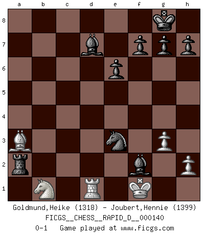 Last move : 0-1 2022 January 4 10:20:39 [Event "FICGS__CHESS__RAPID_D__000140"] [Site "FICGS"] [Date "2021.10.06"] [Round "1"] [White "Goldmund,Heike"] [Black "Joubert,Hennie"] [Result "0-1"] [WhiteElo "1318"] [BlackElo "1399"] 1.e4 c5 2.b4 cxb4 3.a3 bxa3 4.Nxa3 Nc6 5.Nf3 d6 6.d4 Nf6 7.Bb5 Bd7 8.c3 e6 9.O-O Be7 10.Nc4 Nxe4 11.Qd3 Nf6 12.Ba3 a6 13.Ba4 O-O 14.Rab1 Rb8 15.Rfe1 b5 16.Bxb5 axb5 17.Ncd2 Na5 18.c4 bxc4 19.Nxc4 Nxc4 20.Qxc4 Qa5 21.Bb4 Qb5 22.Qxb5 Rxb5 23.Nd2 Nd5 24.Ba3 Rfb8 25.Rec1 Rxb1 26.Nxb1 Bf6 27.Bxd6 Rb6 28.Bc5 Rb2 29.Ba3 Ra2 30.g3 Bxd4 31.Rd1 Bxf2+ 32.Kf1 Ne3+ 0-1 Sicilian : wing gambit, Carlsbad variation Kingside Castling by player White (move 9) Kingside Castling by player Black (move 13) Player Black won this chess game. Follow this game move after move (download)In Chess, as it is played by masters, chance is practically eliminated. (Emanuel Lasker) Mein Gehirn das ist mein zweitwichtigstes Organ [Aus dem Film: Der Schläfer]. (Woody Allen) La maestría del Ajedrez consiste esencialmente en analizar posiciónes de Ajedrez con precisión. (Mikhail Botvinnik) Le succès, c'est être capable d'aller d'échec en échec sans perdre son enthousiasme. (Winston Churchill) A woman without a man is like a fish without a bicycle. (Gloria Steinem)