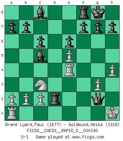 Last move : 0-1 2021 November 7 11:26:5 [Event "FICGS__CHESS__RAPID_D__000140"] [Site "FICGS"] [Date "2021.10.06"] [Round "1"] [White "Brand Lyard,Paul"] [Black "Goldmund,Heike"] [Result "0-1"] [WhiteElo "1677"] [BlackElo "1318"] 1.d4 Nf6 2.Bg5 e6 3.Bxf6 Qxf6 4.e4 d6 5.Bb5+ Nd7 6.Bxd7+ Bxd7 7.Nf3 Be7 8.O-O O-O 9.Re1 c6 10.g3 Rad8 11.e5 dxe5 12.dxe5 Qf5 13.Nc3 Bc8 14.Qc1 Qxf3 15.Re3 Qf5 16.h4 Bc5 17.Re4 Qxf2+ 18.Kh1 Rd2 19.Qg1 Qf3+ 20.Qg2 Qxg2+ 0-1 Trompowsky attack (Ruth, Opovcensky Opening) Kingside Castling by player White (move 8) Kingside Castling by player Black (move 8) Player Black won this chess game. Follow this game move after move (download)Chess opens and enriches your mind. (Saudin Robovic) Ich hatte Angst gegen einen russischen Großmeister zu verlieren, und er befürchtete gegen einen kleinen Jungen zu verlieren. (über ein Remis gegen Juri Awerbach). (Robert James Fischer) Hasta este punto, las blancas han seguido un análisis bien conocido. Pero ahora el hace un error fatal: empieza a usar su propia cabeza. (Siegbert Tarrasch) Horreur, mais aussi harmonie suprême : qu'y avait-il en effet au monde en dehors des échecs ? Le brouillard, l'inconnu, le non-être... (Vladimir Nabokov) The next best thing to gambling and winning is gambling and loosing. (Nick Dandalos)
