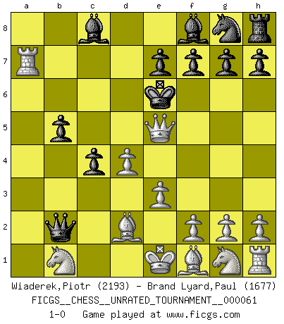 Last move : 1-0 2021 October 13 8:7:39 [Event "FICGS__CHESS__UNRATED_TOURNAMENT__000061"] [Site "FICGS"] [Date "2021.10.07"] [Round "1"] [White "Wiaderek,Piotr"] [Black "Brand Lyard,Paul"] [Result "1-0"] [WhiteElo "2193"] [BlackElo "1677"] 1.d4 d5 2.c4 dxc4 3.e3 b5 4.a4 c6 5.axb5 cxb5 6.Qf3 Qd6 7.Qxa8 Qb4+ 8.Bd2 Qxb2 9.Qxb8 Kd7 10.Rxa7+ Ke6 11.Qe5+ 1-0 Queen's gambit accepted Player White won this chess game. Follow this game move after move (download)Fischer Chess play was always razor-sharp, rational and brilliant. One of the best ever. (Dave Regis) Es ist im Leben wie im Schachspiel. Wir entwerfen einen Plan, dieser bleibt jedoch bedingt durch das, was im Schachspiel dem Gegner, im Leben dem Schicksal zu tun belieben wird. (Arthur Schopenhauer) El Ajedrez es una hermosa aventura. (Bent Larsen) J'apprécie les joueurs d'est-indienne, c'est grâce à eux que je nourris ma famille depuis tant d'années. (Petrosian) I just play for fun. (Anna Kournikova)