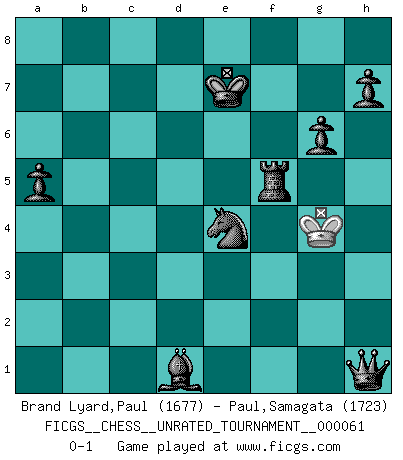 Last move : 0-1 2021 October 16 21:54:58 [Event "FICGS__CHESS__UNRATED_TOURNAMENT__000061"] [Site "FICGS"] [Date "2021.10.07"] [Round "1"] [White "Brand Lyard,Paul"] [Black "Paul,Samagata"] [Result "0-1"] [WhiteElo "1677"] [BlackElo "1723"] 1.e4 e5 2.Bc4 c6 3.Qh5 Qe7 4.Nf3 d6 5.Ng5 g6 6.Qg4 Bxg4 7.Bxf7+ Qxf7 8.Nxf7 Kxf7 9.f3 Be6 10.O-O Nf6 11.d3 Bg7 12.f4 Ke7 13.fxe5 dxe5 14.Bg5 Nbd7 15.Bxf6+ Bxf6 16.a4 a5 17.c4 Nc5 18.Rd1 Rad8 19.Na3 Rd7 20.d4 exd4 21.Rf1 Rf8 22.h3 d3 23.Rxf6 Rxf6 24.e5 Rf4 25.g3 Re4 26.g4 Rxe5 27.Rd1 Nxa4 28.Rd2 b5 29.cxb5 cxb5 30.b3 Bxb3 31.Nxb5 Rxb5 32.g5 Rxg5+ 33.Kf2 Nc5 34.Ke3 Rg3+ 35.Kf4 Rxh3 36.Ke5 Re3+ 37.Kf4 Re2 38.Rxe2+ dxe2 39.Kf3 e1Q 40.Kf4 Rd5 41.Kg4 Rf5 42.Kh3 Qh1+ 43.Kg3 Ne4+ 44.Kg4 Bd1+ 0-1 Bishop's Opening : Philidor counter-attack Kingside Castling by player White (move 10) 10 pieces endgame at move 38 : White KR , Black KRBNPPPP WHITE : King + 1 Rook BLACK : King + 1 Rook 1 Bishop 1 Knight 4 Pawns 9 pieces endgame at move 38 : White K , Black KRBNPPPP WHITE : King + BLACK : King + 1 Rook 1 Bishop 1 Knight 4 Pawns Promotion Queen by player Black (move 39) Player Black won this chess game. Follow this game move after move (download)Castle early and often. (Rob Sillars) Früher wurde jeder komplizierte Zug, jedes interessante Opfer mit großem Beifall und Enthusiasmus aufgenommen. Heute schaltet man einfach seinen Fritz an, und man kann sehen, was los ist, ob der Zug geht oder nicht. (Vladimir Kramnik) Un entendimiento minucioso de las típicas continuaciones de mate hacen de las mas complicadas combinaciones de sacrificio que conducen hacia ellas no solo no dificiles, sino casi un asunto de rutina. (Siegbert Tarrasch) Les Echecs sont affaire de jugement sensible. Savoir quand frapper et quand esquiver. (Fischer) If only people were all showed a certain minimum level of niceness; if only people didn't retract verbal draw offers (without draw box ticked) on ficgs; if only people didn't kill; if only people didn't run concentration / extermination camps, if only people didn't drop nuclear bombs on Hiroshima and Nagasaki, and so on - it would be a much more beautiful world. But sadly, things are not so... (Normajean Yates)