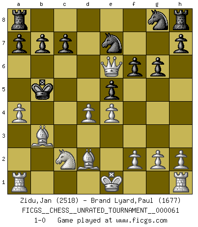 Last move : 1-0 2021 November 8 11:34:52 [Event "FICGS__CHESS__UNRATED_TOURNAMENT__000061"] [Site "FICGS"] [Date "2021.10.07"] [Round "1"] [White "Zidu,Jan"] [Black "Brand Lyard,Paul"] [Result "1-0"] [WhiteElo "2518"] [BlackElo "1677"] 1.e4 e5 2.Nf3 Nc6 3.Bc4 Bc5 4.b4 Bxb4 5.c3 Bc5 6.d4 d6 7.dxc5 Bg4 8.cxd6 Bxf3 9.Qxf3 f6 10.Qg4 g6 11.Qe6+ Nce7 12.Qf7+ Kd7 13.Na3 Kxd6 14.Qe6+ Kc5 15.Be3+ Qd4 16.cxd4+ Kb4 17.Nc2+ Ka4 18.Bb3+ Ka5 19.Bd2+ Kb5 20.a4+ 1-0 Evans gambit Player White won this chess game. Follow this game move after move (download)Chess, like love, like music, has the power to make people happy. (Siegbert Tarrasch) Computer sind die einzigen Gegner, die nicht immer eine Ausrede auf Lager haben, wenn sie gegen mich verlieren. (Robert James Fischer) El Ajedrez, como la música, como el amor, tiene el poder de hacer feliz a la gente. (Siegbert Tarrasch) Les échecs, c'est la lutte contre l'erreur. (Johannes Zukertort) The smarter you play, the luckier you'll be. (Mark Pilarski)