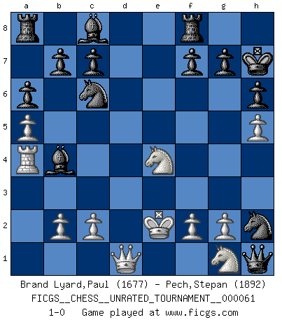 Last move : 1-0 2021 December 29 22:41:31 [Event "FICGS__CHESS__UNRATED_TOURNAMENT__000061"] [Site "FICGS"] [Date "2021.10.07"] [Round "1"] [White "Brand Lyard,Paul"] [Black "Pech,Stepan"] [Result "1-0"] [WhiteElo "1677"] [BlackElo "1892"] 1.a4 d5 2.h4 e5 3.h5 Nc6 4.a5 a6 5.e3 Nf6 6.d4 exd4 7.exd4 h6 8.Bd3 Nxd4 9.Be3 Nc6 10.Nc3 d4 11.Bxd4 Qxd4 12.Ra4 Bb4 13.Rh4 Qxh4 14.Kf1 O-O 15.Nf3 Qh1+ 16.Ng1 Ng4 17.Bh7+ Kxh7 18.Ne4 Nh2+ 19.Ke2 1-0 This chess game has been lost on time (started : 2021.10.07 0:6:47) Ware (Meadow Hay) Opening Kingside Castling by player Black (move 14) Player White won this chess game. Follow this game move after move (download)Bobby Fischer is the greatest Chess player who has ever lived. (Ken Smith) Wenn Du nicht kämpfst, um anderen etwas zu beweisen, sondern nur für Dich selbst, dann bist du fast unbesiegbar. (Garry Kasparov) El Ajedrez es una manera fabulosa para que los niños aprendan a autovalorarse y a autoestimarse. (Saudin Robovic) Même un GMI sait rarement calculer sur plus de cinq coups une attaque à sacrifices. (Rudolf Spielmann) A good book on your shelf is a friend that turns its back on you and remains a friend. (Author unknown)