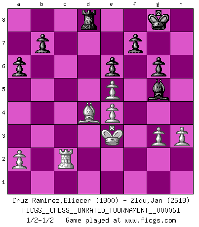 Last move : 1/2-1/2 2022 January 18 1:42:53 [Event "FICGS__CHESS__UNRATED_TOURNAMENT__000061"] [Site "FICGS"] [Date "2021.10.07"] [Round "1"] [White "Cruz Ramirez,Eliecer"] [Black "Zidu,Jan"] [Result "1/2-1/2"] [WhiteElo "1800"] [BlackElo "2518"] 1.d4 Nf6 2.c4 g6 3.Nc3 d5 4.cxd5 Nxd5 5.e4 Nxc3 6.bxc3 Bg7 7.Be3 c5 8.Nf3 Qa5 9.Qd2 Nc6 10.Rb1 a6 11.Rc1 cxd4 12.cxd4 Qxd2+ 13.Kxd2 e6 14.Bd3 O-O 15.Rc4 Bd7 16.Rhc1 Rfd8 17.Ke2 h6 18.h3 Bf8 19.Ne5 Nxe5 20.dxe5 Bb5 21.Rd4 Rxd4 22.Bxd4 Rd8 23.Ke3 Bxd3 24.Kxd3 h5 25.g3 h4 26.Rc2 hxg3 27.fxg3 Be7 28.Ke3 Bg5+ 29.Kd3 Be7 30.Ke3 Bg5+ 1/2-1/2 King's Indian defense, 3.Nc3 Kingside Castling by player Black (move 14) This chess game ended in a draw. Follow this game move after move (download)Combinations have always been the most intriguing aspect of Chess. The masters look for them, the public applauds them, the critics praise them. It is because combinations are possible that Chess is more than a lifeless mathematical exercise. They are the poetry of the game; they are to Chess what melody is to music. They represent the triumph of mind over matter. (Reuben Fine) Was ist der Unterschied zwischen einem Strassenarbeiter und einem Schachspieler? --Der Schachspieler bewegt sich ab und zu. (Anonymous) El Ajedrez por encima de todo... ¡es una pelea!. (Emanuel Lasker) Je ne suis pas le dernier à jouer lâchement des coups douteux pendant le zeïtnot de l'adversaire pour l'achever: en effet les coups qui font le plus peur sont ceux que l'on ne comprend pas. Je me fais souvent peur quand je joue. (Un professeur anonyme) Winning isn't everything... but losing is nothing. (Mednis)