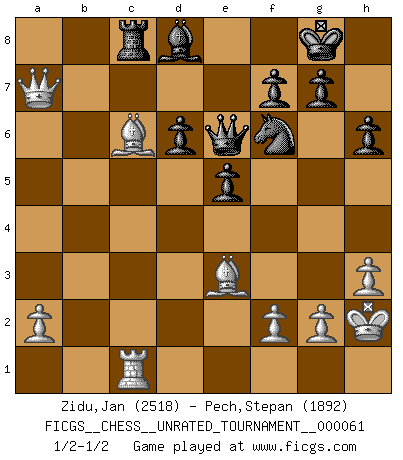 Last move : 1/2-1/2 2022 May 21 11:55:2 [Event "FICGS__CHESS__UNRATED_TOURNAMENT__000061"] [Site "FICGS"] [Date "2021.10.07"] [Round "1"] [White "Zidu,Jan"] [Black "Pech,Stepan"] [Result "1/2-1/2"] [WhiteElo "2518"] [BlackElo "1892"] 1.e4 c5 2.Nf3 Nc6 3.d4 cxd4 4.c3 dxc3 5.Nxc3 e6 6.Be2 d6 7.O-O Be7 8.Qb3 Nf6 9.Rd1 e5 10.h3 O-O 11.Be3 h6 12.Rac1 Rb8 13.Nd5 Be6 14.Qa4 Re8 15.b4 Nxe4 16.b5 Bxd5 17.Rxd5 Nd4 18.Nxd4 Nf6 19.Nc6 bxc6 20.R5d1 cxb5 21.Bxb5 Rf8 22.Bxa7 Rc8 23.Rc6 Rxc6 24.Bxc6 Qc7 25.Be3 Rc8 26.Rc1 Rb8 27.Qa6 Bd8 28.Bd5 Qd7 29.Bc6 Qe6 30.Qa7 Rc8 31.Kh2 1/2-1/2 Sicilian defense Kingside Castling by player White (move 7) Kingside Castling by player Black (move 10) This chess game ended in a draw. Follow this game move after move (download)No other master has such a terrific will to win. At the board he radiates danger, and even the strongest opponents tend to freeze, like rabbits when they smell a panther. Even his weaknesses are dangerous. As white, his opening game is predictable - you can make plans against it - but so strong that your plans almost never work. In the middle game his precision and invention are fabulous, and in the end game you simply cannot beat him. (Anonymous German Expert) Kein Schachspieler kann gut schlafen. (H. G. Wells) El Ajedrez es en su esencia, un juego. En su forma, un arte. Y en su ejecución, una ciencia. (Baron Tassilo) Aux échecs, l'amour-propre est satisfait quand on remporte la victoire, mais il n'y a pas de honte à être battu. (Benjamin Franklin) There is far too much law for those who can afford it and far too little for those who cannot. (Derek Bok)