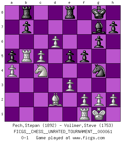 Last move : 0-1 2022 April 23 9:21:42 [Event "FICGS__CHESS__UNRATED_TOURNAMENT__000061"] [Site "FICGS"] [Date "2021.10.07"] [Round "1"] [White "Pech,Stepan"] [Black "Vollmer,Steve"] [Result "0-1"] [WhiteElo "1892"] [BlackElo "1753"] 1.Nf3 d5 2.c4 c6 3.e3 Nf6 4.d4 g6 5.Nc3 Bg7 6.Be2 O-O 7.O-O Nbd7 8.cxd5 cxd5 9.Qb3 Nb6 10.a4 a5 11.Ne5 Be6 12.Nd3 Ne4 13.Nf4 Nxc3 14.bxc3 Bc8 15.Rb1 Nc4 16.Nxd5 Nd6 17.c4 Bf5 18.Bd3 Bxd3 19.Qxd3 Rb8 20.c5 Nf5 21.Nb6 e5 22.d5 Qc7 23.Rb5 Rfe8 24.Qe4 Nh6 25.Bd2 f5 26.Qc4 Qf7 27.d6 Qxc4 28.Nxc4 Ng4 0-1 This chess game has been lost on time (started : 2021.10.07 0:6:47) Reti Opening Kingside Castling by player Black (move 6) Kingside Castling by player White (move 7) Player Black won this chess game. Follow this game move after move (download)I prefer to lose a really good game than to win a bad one. (David Levy) Alle Schachspieler sollten auch ein Hobby haben. (Savielly Grigorievitsch Tartakower) El Ajedrez es un cuento de Hadas de las 1001 metidas de pata. (Savielly Tartakower) Si je n'étais pas joueur d'échecs, je serais le meilleur dans quelque chose d'autre. (Anatoli Karpov) I think your argument is specious - I think your tie is ugly. (Gregory House to Dr. Foreman, House M.D.)