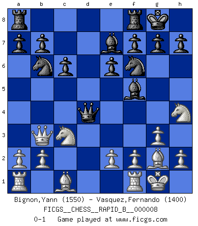 Last move : 0-1 2006 August 24 18:38:35 [Event "FICGS__CHESS__RAPID_B__000008"] [Site "FICGS"] [Date "2006.06.24"] [Round "1"] [White "Bignon,Yann"] [Black "Vasquez,Fernando"] [Result "0-1"] [WhiteElo "1550"] [BlackElo "1400"] 1.d4 d5 2.c4 dxc4 3.Qa4+ c6 4.Qxc4 Nf6 5.Nf3 Bf5 6.g3 e6 7.Bg2 Nbd7 8.Nc3 Be7 9.O-O O-O 10.Nh4 Nb6 11.Qb3 Qxd4 0-1 This chess game has been lost on time (started : 2006.06.24 18:33:5) Queen's gambit accepted Kingside Castling by player White (move 9) Kingside Castling by player Black (move 9) Player Black won this chess game. Follow this game move after move (download)I prefer to lose a really good game than to win a bad one. (David Levy) Alle Schachspieler sollten auch ein Hobby haben. (Savielly Grigorievitsch Tartakower) El hombre es un frívolo, una creatura engañosa y como un jugador de Ajedrez, se preocupa mas por el proceso de obtener su meta que de la meta por sí misma. (Dostoyevsky) Si je n'étais pas joueur d'échecs, je serais le meilleur dans quelque chose d'autre. (Anatoli Karpov) We're missing something. (Gregory House, House M.D.)