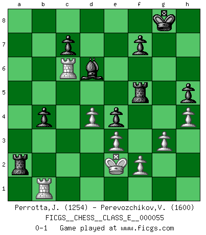 Last move : 0-1 2007 September 28 18:0:30 [Event "FICGS__CHESS__CLASS_E__000055"] [Site "FICGS"] [Date "2007.07.21"] [Round "1"] [White "Perrotta,John Zach"] [Black "Perevozchikov,Vjacheslav"] [Result "0-1"] [WhiteElo "1254"] [BlackElo "1600"] 1.b4 e5 2.Bb2 Bxb4 3.Bxe5 Nf6 4.Nf3 Nc6 5.Bb2 d5 6.e3 O-O 7.Bb5 Re8 8.O-O Bg4 9.a3 Bd6 10.Be2 Qe7 11.Nc3 a6 12.d4 Qe6 13.a4 Nb4 14.Ng5 Bxe2 15.Qxe2 Qf5 16.Nf3 Qxc2 17.Qxc2 Nxc2 18.Rac1 Nb4 19.Rfd1 Ne4 20.Ba3 Rad8 21.Nxe4 dxe4 22.Bxb4 Bxb4 23.Ng5 Rd5 24.Nh3 Bd6 25.Rb1 b6 26.Rdc1 g5 27.Kf1 h5 28.g3 b5 29.axb5 axb5 30.Ke2 b4 31.Rc6 Ra8 32.Kd2 Rda5 33.Nxg5 Rxg5 34.h4 Rf5 35.Ke2 Ra2+ 0-1 Polish (Sokolsky) opening Kingside Castling by player Black (move 6) Kingside Castling by player White (move 8) Player Black won this chess game. Follow this game move after move (download)The stomach is an essential part of the Chess master. (Bent Larsen) Drei Punkte vor allen anderen ist wie einer, der im weißen Anzug posiert, während der Rest in Müllsäcke gekleidet dasteht. (Viktor Kortschnoi) Siempre es mucho mejor sacrificar las piezas de tu oponente. (Savielly Tartakover) C'est une question de caractère, Beaucoup de gens perdent leur motivation très vite. D'autres, ils sont rares, peuvent la conserver très longtemps. J'aime les échecs, encore aujourd'hui je suis heureux d'analyser des parties. J'aime toujours gagner, je déteste encore perdre. Bien jouer est important pour mon intégrité intellectuelle et morale. Et puis les échecs vivent en ce moment une période historique grâce à Internet. Ils se développent dans les systèmes éducatifs à travers le monde. Ils sortent de leur ghetto, et c'est mon rôle de mener à bien cette révolution. (Gary Kasparov) Man with more than one clock never knows what time it is. (Chinese thought)