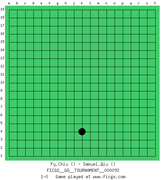 Last move : 1-0 2021 November 7 10:10:12 [Event "FICGS__GO__TOURNAMENT__000092"] [Site "FICGS"] [Date "2021.10.07"] [Round "1"] [Black "Fy,Chiu"] [White "Samuel,Qiu"] [Result "1-0"] 1.k4 1-0 This go game has been lost on time (started : 2021.10.07 17:7:7) Here are the names of the openings (joseki) played in the four corners : Player Black won this Go (weiqi, baduk) game. Follow this game move after move (download)Knight's moves win running battles. (Anonymous) My poor ole parrot... Is not in the circulation of displays ....poo hoo hoo :) (Wayne Lowrance's enigma)