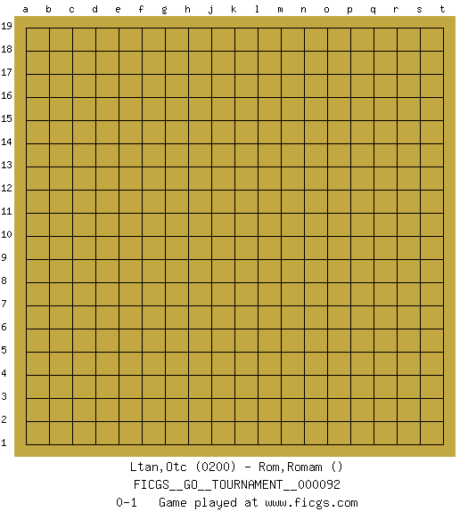 Last move : 0-1 2021 November 6 19:42:0 [Event "FICGS__GO__TOURNAMENT__000092"] [Site "FICGS"] [Date "2021.10.07"] [Round "1"] [Black "Ltan,Otc"] [White "Rom,Romam"] [Result "0-1"] [Rating 1 "0200"] 0-1 This go game has been lost on time (started : 2021.10.07 17:7:7) Here are the names of the openings (joseki) played in the four corners : Player White won this Go (weiqi, baduk) game. Follow this game move after move (download)Go uses the most elemental materials and concepts - line and circle, wood and stone, black and white - combining them with simple rules to generate subtle strategies and complex tactics that stagger the imagination. (Iwamoto Kaoru, 9 dan professional Go player and former Honinbo title holder) Horse racing is animated roulette. (Roger Kahn)