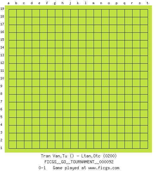 Last move : 0-1 2021 November 6 19:42:0 [Event "FICGS__GO__TOURNAMENT__000092"] [Site "FICGS"] [Date "2021.10.07"] [Round "1"] [Black "Tran Van,Tu"] [White "Ltan,Otc"] [Result "0-1"] [Rating 2 "0200"] 0-1 This go game has been lost on time (started : 2021.10.07 17:7:7) Here are the names of the openings (joseki) played in the four corners : Player White won this Go (weiqi, baduk) game. Follow this game move after move (download)Keshi is worth as much as an invasion ! (Anonymous) Art is not a thing, it is a way. (Elbert Hubbard)