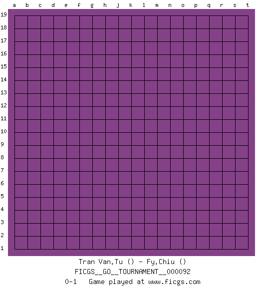 Last move : 0-1 2021 November 6 19:42:0 [Event "FICGS__GO__TOURNAMENT__000092"] [Site "FICGS"] [Date "2021.10.07"] [Round "1"] [Black "Tran Van,Tu"] [White "Fy,Chiu"] [Result "0-1"] 0-1 This go game has been lost on time (started : 2021.10.07 17:7:7) Here are the names of the openings (joseki) played in the four corners : Player White won this Go (weiqi, baduk) game. Follow this game move after move (download)One big eye kills one small eye. (Anonymous) Rules and bones are meant to be broken. (Anonymous)