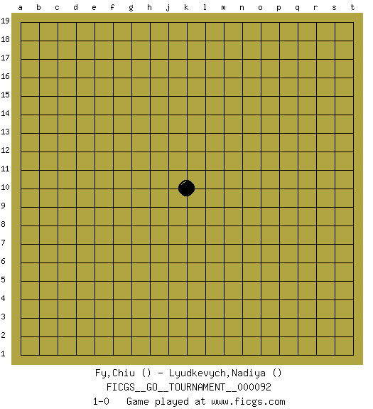 Last move : 1-0 2021 November 7 22:30:41 [Event "FICGS__GO__TOURNAMENT__000092"] [Site "FICGS"] [Date "2021.10.07"] [Round "1"] [Black "Fy,Chiu"] [White "Lyudkevych,Nadiya"] [Result "1-0"] 1.k10 1-0 This go game has been lost on time (started : 2021.10.07 17:7:7) Here are the names of the openings (joseki) played in the four corners : Player Black won this Go (weiqi, baduk) game. Follow this game move after move (download)Beginner's games are surprising, often incoherent and incomprehensible. When you improve, your game gains in consistency but flirts with stupidity: you become satisfied with truisms and mechanical movements, you try to obtain a feeling for clearness and style the easy way. (Pierre Audouard) Big Chess is a place for big hallucinations. (Thibault de Vassal)