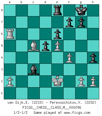 Last move : 1/2-1/2 2022 April 29 21:9:0 [Event "FICGS__CHESS__CLASS_M__000096"] [Site "FICGS"] [Date "2021.10.09"] [Round "1"] [White "van Dijk,Erik L."] [Black "Perevozchikov,Vjacheslav"] [Result "1/2-1/2"] [WhiteElo "2215"] [BlackElo "2232"] 1.e4 e6 2.d4 d5 3.Nc3 Nf6 4.e5 Nfd7 5.f4 c5 6.Nf3 Nc6 7.Be3 cxd4 8.Nxd4 Qb6 9.Qd2 Qxb2 10.Rb1 Qa3 11.Bb5 Nxd4 12.Bxd4 a6 13.Bxd7+ Bxd7 14.Rb3 Qe7 15.Rxb7 Rc8 16.O-O Qd8 17.Ne2 Be7 18.Ng3 h5 19.Rfb1 Rc7 20.Qa5 Rxb7 21.Qxd8+ Bxd8 22.Rxb7 Ba4 23.c3 h4 24.Ne2 O-O 25.Bc5 Re8 26.Ra7 Bd1 27.Kf1 Ba5 28.Rxa6 Bxe2+ 29.Kxe2 Bxc3 1/2-1/2 French : Steinitz, Boleslavsky variation Kingside Castling by player White (move 16) Kingside Castling by player Black (move 24) This chess game ended in a draw. Follow this game move after move (download)Nonsense was the last thing Fischer was interested in, as far as Chess was concerned. (Elie Agur) Dein Körper muss in Topform sein. Dein Schach verfällt, wenn dein Körper verfällt. Der Körper kann nicht vom Geist getrennt werden. (Robert James Fischer) Botvinnik trató de alejar el misterio referente al Ajedrez, siempre relacionandolo a situaciones de la vida diaria. Solía llamar al Ajedrez un problema inexacto típico, similar a aquellos en que la gente tiene siempre que resolver a cada día. (Garry Kasparov) C'est la seule position que je connaisse où les deux camps sont mals. Propos prêtés à V. Anand. CHESS, n. f. [echecs, Fr.] A nice and abstruse game, in which two sets of puppets are moved in opposition to each other. (Dr Samuel Johnson, A Dictionary Of The English Language, 1755)