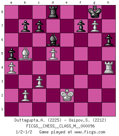 Last move : 1/2-1/2 2022 January 31 3:42:21 [Event "FICGS__CHESS__CLASS_M__000096"] [Site "FICGS"] [Date "2021.10.09"] [Round "1"] [White "Duttagupta,Aniruddha"] [Black "Osipov,Sergey"] [Result "1/2-1/2"] [WhiteElo "2225"] [BlackElo "2212"] 1.e4 e5 2.Nf3 Nc6 3.Bc4 Nf6 4.d3 Bc5 5.c3 d6 6.O-O O-O 7.Nbd2 a5 8.a4 h6 9.Re1 Ne7 10.Nf1 Ng6 11.Ng3 Be6 12.Qb3 Bg4 13.d4 Ba7 14.Be3 Bxf3 15.gxf3 d5 16.exd5 Nh4 17.dxe5 Nxf3+ 18.Kg2 Nxe1+ 19.Rxe1 Bxe3 20.exf6 Bf4 21.fxg7 Re8 22.Rd1 Bd6 23.Bb5 Re5 24.f4 Re3 25.Qc4 Qf6 26.Rf1 Rd8 27.Kf2 Qxf4+ 28.Qxf4 Bxf4 29.Ne2 Rxe2+ 30.Kxe2 Bxh2 31.Rh1 Bf4 32.Rh4 Bd6 1/2-1/2 Two knights defense (Modern Bishop's Opening) Kingside Castling by player White (move 6) Kingside Castling by player Black (move 6) This chess game ended in a draw. Follow this game move after move (download)Bobby Fischer is the greatest Chess genius of all time ! (Alexander Kotov) Ein Großmeister muß tausende Partien in seinem Kopf speichern, denn diese sind für Ihn, was die Worte der Muttersprache für gewöhnliche Leute sind, oder Noten für Musiker... (Garry Kasparov) El Ajedrez es un cuento de Hadas de las 1001 metidas de pata. (Savielly Tartakower) Les Echecs, c'est l'art de la guerre sans les charniers, c'est la résurrection des morts tombés au champ d'honneur, l'espoir perpétuel, la suprématie de l'intelligence sur la force, la culture de l'esprit. (F. Szpiner) True nature is revealed in times of difficulty. (Chinese proverb)
