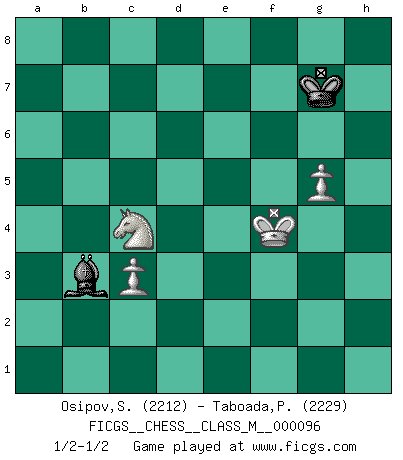 Last move : 1/2-1/2 2022 July 24 21:57:2 [Event "FICGS__CHESS__CLASS_M__000096"] [Site "FICGS"] [Date "2021.10.09"] [Round "1"] [White "Osipov,Sergey"] [Black "Taboada,Pedro Pablo"] [Result "1/2-1/2"] [WhiteElo "2212"] [BlackElo "2229"] 1.e4 e5 2.Nf3 Nc6 3.Bb5 a6 4.Ba4 Nf6 5.O-O Be7 6.Re1 b5 7.Bb3 d6 8.c3 O-O 9.h3 Nb8 10.d4 Nbd7 11.Nbd2 Bb7 12.Bc2 Re8 13.Nf1 Bf8 14.Ng3 g6 15.a4 c5 16.d5 c4 17.Bg5 h6 18.Be3 Nc5 19.Qd2 h5 20.Bxc5 dxc5 21.Nf1 Qc7 22.Qg5 Nh7 23.Qe3 Nf6 24.N1d2 Red8 25.Bd1 Rab8 26.Be2 Kh7 27.Qg5 Kg7 28.Qg3 Bd6 29.Ng5 Qe7 30.h4 Bc8 31.Nf1 Rb6 32.Ra3 Rf8 33.Rea1 Bc7 34.Ne3 Kg8 35.axb5 axb5 36.Ra7 Bb7 37.Rd1 Bb8 38.Ra5 Qd7 39.Qf3 Nh7 40.g4 hxg4 41.Qg2 Qd8 42.Qxg4 Qf6 43.Qg3 Qf4 44.Nh3 Qxg3+ 45.fxg3 Kg7 46.Kg2 Nf6 47.Nf2 Ne8 48.h5 Nd6 49.hxg6 fxg6 50.Rda1 Bc7 51.Neg4 Re8 52.Nh2 Bd8 53.Nf3 Bf6 54.Bd1 Bc8 55.Ra7+ Bb7 56.Bc2 Bd8 57.Ng4 Nf7 58.Kf2 Bc7 59.Kg2 Bb8 60.R7a5 Bc7 61.Nf2 Bd8 62.Ra7 Bc7 63.Bd1 Bb8 64.R7a3 Bc7 65.Nd2 Nd6 66.Bg4 Bd8 67.Ra5 Bf6 68.Ra7 Re7 69.R7a2 Re8 70.Ra5 Re7 71.Nf3 b4 72.R1a2 Rc7 73.Be6 Nb5 74.Nd1 Nd6 75.Nf2 Nb5 76.Rxb5 Rxb5 77.d6 Rc6 78.Bd7 Ra6 79.Rxa6 Bxa6 80.Bxb5 Bxb5 81.Ng4 Bc6 82.Kf2 Bxe4 83.Nxf6 Kxf6 84.Nxe5 Bf5 85.g4 bxc3 86.bxc3 Bc2 87.Ke3 g5 88.Nd7+ Ke6 89.Nxc5+ Kxd6 90.Ne4+ Ke5 91.Nxg5 Bd1 92.Nf3+ Kd5 93.Kf4 Ke6 94.g5 Ba4 95.Nd2 Bb3 96.Nf1 Bc2 97.Ne3 Bd3 98.Ng4 Bc2 99.Ne5 Bb3 100.Ke4 Bc2+ 101.Kf4 Bb3 102.Nc6 Ba4 103.Nd4+ Kf7 104.Nf5 Ke6 105.Nd4+ Kf7 106.Kg4 Bd1+ 107.Kh3 Ba4 108.Nf3 Bd1 109.Kg3 Kg6 110.Kg4 Kg7 111.Kf4 Ba4 112.Ne5 Bb3 113.Nxc4 1/2-1/2 Ruy Lopez : Closed Kingside Castling by player White (move 5) Kingside Castling by player Black (move 8) 10 pieces endgame at move 86 : White KNPPP , Black KBPPP WHITE : King + 1 Knight 3 Pawns BLACK : King + 1 Bishop 3 Pawns 9 pieces endgame at move 89 : White KNPPP , Black KBPP WHITE : King + 1 Knight 3 Pawns BLACK : King + 1 Bishop 2 Pawns 8 pieces endgame at move 89 : White KNPP , Black KBPP WHITE : King + 1 Knight 2 Pawns BLACK : King + 1 Bishop 2 Pawns 7 pieces endgame at move 91 : White KNPP , Black KBP WHITE : King + 1 Knight 2 Pawns BLACK : King + 1 Bishop 1 Pawn 6 pieces endgame at move 113 : White KNPP , Black KB WHITE : King + 1 Knight 2 Pawns BLACK : King + 1 Bishop This chess game ended in a draw. Follow this game move after move (download)The hardest game to win is a won game. (Emanuel Lasker) Ich war zu klein für die Schach-Schülermannschaft! (Woody Allen) Yo creo que el Ajedrez posee una magia que es también una ayuda en la edad avanzada. Una rodilla reumática es olvidada durante una partida de Ajedrez y otros eventos pueden parecer algo sin importancia comparada a una catástrofe en el tablero de Ajedrez. (Vlastimil Hort) Votre prénom est 'Tactique', votre deuxième prénom est 'Tactique' et votre nom est 'Tactique'. (Ken Smith) Good luck. You're gonna need it. (Han Solo in Star Wars ep.6)
