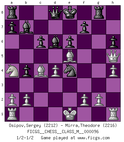 Last move : 1/2-1/2 2021 October 13 13:45:53 [Event "FICGS__CHESS__CLASS_M__000096"] [Site "FICGS"] [Date "2021.10.09"] [Round "1"] [White "Osipov,Sergey"] [Black "Mirra,Theodore"] [Result "1/2-1/2"] [WhiteElo "2212"] [BlackElo "2216"] 1.d4 Nf6 2.Nf3 d5 3.c4 c6 4.Nc3 e6 5.Bg5 h6 6.Bh4 dxc4 7.e4 g5 8.Bg3 b5 9.h4 g4 10.Ne5 Nbd7 11.Be2 Bb7 12.Bxg4 b4 13.Na4 Nxe5 14.Bxe5 Rg8 15.Be2 Nxe4 16.Bxc4 Bd6 17.Qh5 1/2-1/2 Queen's pawn game This chess game ended in a draw. Follow this game move after move (download)When you don't know what to do, wait for your opponent to get an idea - it's sure to be wrong. (Tarrasch) Auf jeden Fall musst du zuerst Rechtsanwalt werden, damit du deine eigenen Interessen und die deiner Familie vertreten kannst. [Brief an seinen Sohn] (José Raúl Capablanca) El Ajedrez lo es todo: arte, ciencia y deporte. (Anatoly Karpov) Si rien de grave n'est détecté lors de l'analyse d'une position, on joue alors le coup. Seconde règle de Blumenfeld. Unless I accept my faults I will most certainly doubt my virtues. (Hugh Prather)