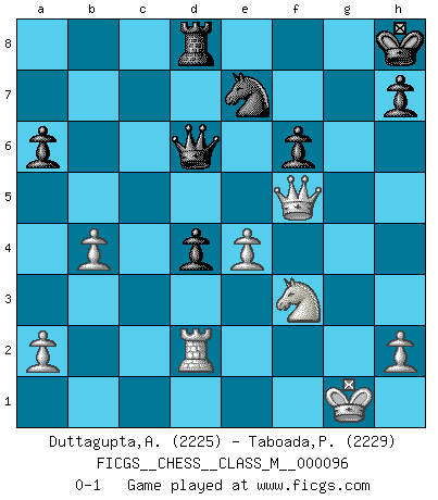Last move : 0-1 2022 September 13 6:54:31 [Event "FICGS__CHESS__CLASS_M__000096"] [Site "FICGS"] [Date "2021.10.09"] [Round "1"] [White "Duttagupta,Aniruddha"] [Black "Taboada,Pedro Pablo"] [Result "0-1"] [WhiteElo "2225"] [BlackElo "2229"] 1.d4 Nf6 2.c4 e6 3.Nf3 b6 4.g3 Ba6 5.Qa4 Bb7 6.Bg2 c5 7.dxc5 bxc5 8.O-O Be7 9.Nc3 O-O 10.Bf4 Qb6 11.Rfd1 Rd8 12.Rd2 d6 13.Rad1 Ne8 14.g4 Nc6 15.g5 Rac8 16.b3 Bf8 17.e3 a6 18.Ne1 Nb4 19.Bxb7 Qxb7 20.f3 f5 21.gxf6 Nxf6 22.Bg3 Rd7 23.Be5 Kh8 24.Kf2 Rcd8 25.Bxf6 gxf6 26.Ne4 Nc6 27.f4 Be7 28.Nf3 d5 29.cxd5 exd5 30.Ng3 Bf8 31.Nh5 d4 32.e4 Bh6 33.Qc4 Qc7 34.Qxc5 Bxf4 35.Nxf4 Qxf4 36.Qf5 Qd6 37.b4 Rg7 38.Rg1 Rxg1 39.Kxg1 Ne7 0-1 This chess game has been lost on time (started : 2021.10.09 13:13:34) Queen's Indian : Nimzovich variation (exaggerated Fianchetto) Kingside Castling by player White (move 8) Kingside Castling by player Black (move 9) Player Black won this chess game. Follow this game move after move (download)The most powerful weapon in Chess is to have the next move. (David Bronstein) Karpov ist ein Museumsstück. (Garry Kasparov) Una victoria por una combinación errónea, aunque sea espectacular, me llena de horror artístico. (Wilhelm Steinitz) Que feriez-vous si vous étiez en train de jouer aux échecs et que la fin du monde arrive ? Je continuerais à jouer. (Saint Borromée) If only people were all showed a certain minimum level of niceness; if only people didn't retract verbal draw offers (without draw box ticked) on ficgs; if only people didn't kill; if only people didn't run concentration / extermination camps, if only people didn't drop nuclear bombs on Hiroshima and Nagasaki, and so on - it would be a much more beautiful world. But sadly, things are not so... (Normajean Yates)