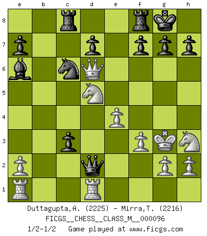 Last move : 1/2-1/2 2022 January 13 17:2:34 [Event "FICGS__CHESS__CLASS_M__000096"] [Site "FICGS"] [Date "2021.10.09"] [Round "1"] [White "Duttagupta,Aniruddha"] [Black "Mirra,Theodore"] [Result "1/2-1/2"] [WhiteElo "2225"] [BlackElo "2216"] 1.d4 Nf6 2.c4 e6 3.Nc3 Bb4 4.f3 c5 5.d5 b5 6.e4 O-O 7.Nh3 bxc4 8.Bxc4 exd5 9.Bxd5 Nxd5 10.Qxd5 Ba6 11.Bf4 Nc6 12.Kf2 c4 13.Rhd1 Be7 14.Bd6 Qb6+ 15.Kg3 Rac8 16.Na4 Bxd6+ 17.Qxd6 Qb5 18.Nc3 Qxb2 19.Nd5 c3 20.Rdb1 Qd2 21.Rd1 Qb2 22.Rdb1 Qd2 23.Rd1 1/2-1/2 Nimzo-Indian : Kmoch variation Kingside Castling by player Black (move 6) This chess game ended in a draw. Follow this game move after move (download)The passed pawn is a criminal, who should be kept under lock and key. Mild measures, such as police surveillance, are not sufficient. (Nimzovitch) Ich hatte meine größten Erfolge, als ich 47 Jahre alt war. Kasparow war noch nicht mal 42 und hat das Schach schon im Stich gelassen. (Viktor Kortschnoi) Los tropiezos estan todos ahí en el tablero, esperando que se cometan. (Savielly Tartakover) Les ravages du H expliquent la différence de niveau entre Tal et Thal [Abergel]. Everybody lies. (Gregory House, House M.D.)