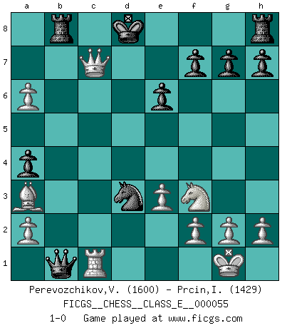 Last move : 1-0 2007 August 16 9:45:57 [Event "FICGS__CHESS__CLASS_E__000055"] [Site "FICGS"] [Date "2007.07.21"] [Round "1"] [White "Perevozchikov,Vjacheslav"] [Black "Prcin,Ivo"] [Result "1-0"] [WhiteElo "1600"] [BlackElo "1429"] 1.d4 d5 2.c4 c6 3.Nf3 Nf6 4.e3 e6 5.Nc3 Bb4 6.Qb3 a5 7.Bd3 dxc4 8.Bxc4 b5 9.Bd3 Bxc3+ 10.bxc3 Nd5 11.O-O a4 12.Qc2 Nd7 13.Ba3 Qb6 14.Rab1 Nc7 15.c4 Ba6 16.Rfc1 Rb8 17.Qc3 c5 18.dxc5 Nxc5 19.cxb5 Nxd3 20.bxa6 Qxb1 21.Qc6+ Kd8 22.Qxc7+ 1-0 QGD Slav : 4.e3 Kingside Castling by player White (move 11) Player White won this chess game. Follow this game move after move (download)Suddenly it was obvious to me in my analysis I had missed what Fischer had found with the greatest of ease at the board. (Mikhail Botvinnik) Die größte Kunst beim Schach besteht darin dem Gegner nicht zu zeigen was er tun kann. (Garry Kasparov) La maestría del Ajedrez consiste esencialmente en analizar posiciónes de Ajedrez con precisión. (Mikhail Botvinnik) Vous n'êtes pas toujours obligé de jouer le meilleur coup. Un coup doit être actif, entreprenant, correct et beau ! (David Bronstein) When you stop learning you start dying. (Scott Adams)