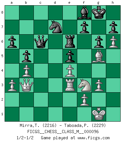 Last move : 1/2-1/2 2022 February 15 12:49:42 [Event "FICGS__CHESS__CLASS_M__000096"] [Site "FICGS"] [Date "2021.10.09"] [Round "1"] [White "Mirra,Theodore"] [Black "Taboada,Pedro Pablo"] [Result "1/2-1/2"] [WhiteElo "2216"] [BlackElo "2229"] 1.d4 Nf6 2.c4 e6 3.Nf3 d5 4.Nc3 Be7 5.Bf4 O-O 6.e3 c5 7.dxc5 Bxc5 8.Qc2 Nc6 9.Rd1 Qa5 10.a3 Be7 11.Be2 dxc4 12.Bxc4 a6 13.O-O b5 14.Bd3 Bb7 15.Ne4 g6 16.h4 Rac8 17.Qe2 Nxe4 18.Bxe4 Qa4 19.Bc2 Qc4 20.Bd3 Qc5 21.Be4 Rfd8 22.Rc1 Qb6 23.h5 Na5 24.Bxb7 Qxb7 25.e4 Nb3 26.Rxc8 Rxc8 27.Qe3 Nc5 28.Re1 Nd7 29.h6 Bc5 30.Qe2 Bf8 31.Nh2 Be7 32.Nf3 Bf8 33.b4 e5 34.Bg5 Rc6 35.Qb2 Re6 36.Rd1 Rd6 37.Re1 Re6 38.Re3 Qc6 39.g3 Rd6 40.Qb3 Re6 41.Qb2 Rd6 42.Qb3 Re6 1/2-1/2 Queen's pawn game Kingside Castling by player Black (move 5) Kingside Castling by player White (move 13) This chess game ended in a draw. Follow this game move after move (download)Good offense and good defense both begin with good development. (Bruce A. Moon) Besser ein falscher Plan, logisch durchgeführt, als gar kein Plan. (Viktor Kortschnoi) Es muy difícil jugar en contra de la teoría de Einstein. - en su primera derrota en contra de Fischer (Mikhail Tal) Avant la finale, les dieux ont créé le milieu de partie. (Tarrasch) Crush them ! Make them suffer ! (General Grievous in Star Wars ep.3)