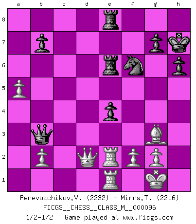 Last move : 1/2-1/2 2021 October 20 1:6:9 [Event "FICGS__CHESS__CLASS_M__000096"] [Site "FICGS"] [Date "2021.10.09"] [Round "1"] [White "Perevozchikov,Vjacheslav"] [Black "Mirra,Theodore"] [Result "1/2-1/2"] [WhiteElo "2232"] [BlackElo "2216"] 1.d4 Nf6 2.c4 e6 3.Bg5 h6 4.Bh4 c5 5.d5 exd5 6.cxd5 d6 7.Nc3 Be7 8.e4 Nbd7 9.Bg3 O-O 10.h3 Re8 11.Nf3 Nxe4 12.Nxe4 Bg5 13.Qc2 f5 14.Be2 fxe4 15.Nxg5 Qxg5 16.O-O Qg6 17.Rae1 Nf6 18.Bxd6 Bxh3 19.Bg3 Bg4 20.Qxc5 Bxe2 21.Rxe2 Qh5 22.Rfe1 Rad8 23.Qxa7 Qxd5 24.Qb6 Re6 25.Qb4 Rde8 26.a4 Kh7 27.Qd2 Qb3 28.a5 1/2-1/2 Neo-Indian (Seirawan) attack Kingside Castling by player Black (move 9) Kingside Castling by player White (move 16) This chess game ended in a draw. Follow this game move after move (download)Pawns: they are the soul of this game, they alone form the attack and defense. (Philidor) Es liegt in der Natur, vernüftig zu denken und unlogisch zu handeln. (Anatole France) El Ajedrez es un invernadero donde los frutos del carácter pueden madurar mas completamente que en la vida. (Edward Morgan Foster) La tactique est l'élément le plus important du milieu de jeu. (Siegbert Tarrasch) A person who never made a mistake never tried anything new. (Albert Einstein)