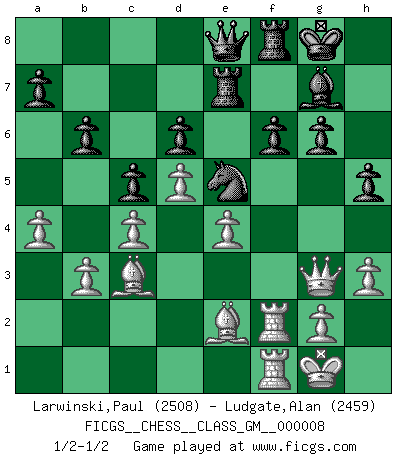 Last move : 1/2-1/2 2022 March 2 15:19:43 [Event "FICGS__CHESS__CLASS_GM__000008"] [Site "FICGS"] [Date "2021.10.09"] [Round "1"] [White "Larwinski,Paul"] [Black "Ludgate,Alan"] [Result "1/2-1/2"] [WhiteElo "2508"] [BlackElo "2459"] 1.d4 Nf6 2.c4 g6 3.Nc3 Bg7 4.e4 d6 5.Be2 O-O 6.Bg5 c5 7.d5 e6 8.Qc1 exd5 9.exd5 Qa5 10.Bd2 Re8 11.Nf3 Bg4 12.O-O Qa6 13.b3 Ne4 14.Nxe4 Rxe4 15.Bd3 Re8 16.Ng5 Nd7 17.Bc3 f6 18.Ne4 Bf5 19.f3 Bxe4 20.fxe4 Re7 21.Qe3 Ne5 22.Be2 Rf8 23.h3 h5 24.Rf2 Qb6 25.Raf1 Qd8 26.Qg3 Qe8 27.a4 b6 28.Qh4 R8f7 29.Qg3 Rf8 1/2-1/2 King's Indian : Averbakh, Main line Kingside Castling by player Black (move 5) Kingside Castling by player White (move 12) This chess game ended in a draw. Follow this game move after move (download)It began to feel as though you were playing against Chess itself. - On playing against Robert Fischer. (Walter Shipman) Ein typischer, sehr verbreiteter Gedankenschädling ist der, daß der betreffende Amateur von der Annanhme ausgeht, daß jeder einzelne Zug etwas zu leisten habe. (Aaron Nimzowitsch) El hombre es un frívolo, una creatura engañosa y como un jugador de Ajedrez, se preocupa mas por el proceso de obtener su meta que de la meta por sí misma. (Dostoyevsky) Des idées, des idées, j'en ai cent, j'en ai mille. Des bonnes, des mauvaises, applicables, irréalisables... Il suffit de faire le tri ! (Roos) All men can see these tactics whereby I conquer, but what none can see is the strategy out of which victory is evolved. (Sun Tzu)