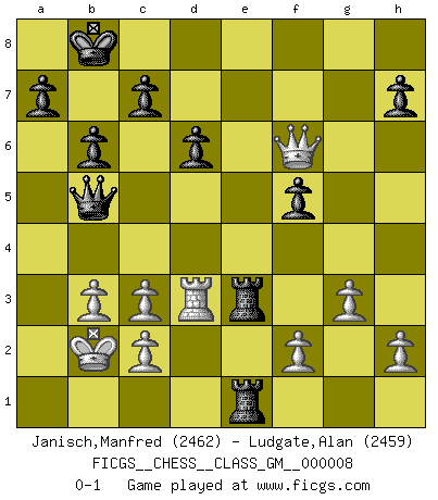 Last move : 0-1 2022 March 30 13:58:48 [Event "FICGS__CHESS__CLASS_GM__000008"] [Site "FICGS"] [Date "2021.10.09"] [Round "1"] [White "Janisch,Manfred"] [Black "Ludgate,Alan"] [Result "0-1"] [WhiteElo "2462"] [BlackElo "2459"] 1.e4 e5 2.Nf3 Nf6 3.Nxe5 d6 4.Nf3 Nxe4 5.Nc3 Nxc3 6.dxc3 Be7 7.Be3 Nc6 8.Qd2 Be6 9.O-O-O Qd7 10.Kb1 Bf6 11.Be2 O-O-O 12.Nd4 Nxd4 13.Bxd4 Bxd4 14.Qxd4 Kb8 15.Qxg7 Bxa2+ 16.Kc1 Be6 17.Bf3 Rdg8 18.Qd4 Bg4 19.Rd3 Bxf3 20.Rxf3 Re8 21.Rd1 f5 22.b3 b6 23.Kb2 Rhf8 24.R1d3 Re1 25.g3 Qb5 26.Rfe3 Re8 27.Qf6 R8xe3 0-1 Petrov : Nimzovich attack Queenside Castling by player White (move 9) Queenside Castling by player Black (move 11) Player Black won this chess game. Follow this game move after move (download)If one piece is badly posted, the whole game is bad. (Tarrasch) Frage: Was machen Sie mit den Preisen? Anwort: Ich habe Angst, dass meine Freundin davon neue Kleider kauft. (Loek van Wely) Jugadores de primera clase pierden en contra de jugadores de segunda clase porque los jugadores de segunda clase a veces juegan una partida de primer clase. (Siegbert Tarrasch) Les Echecs sont et restent toujours un combat, un combat intégral comme la boxe, la lutte ou un autre sport, et où il doit y avoir un vainqueur et un vaincu. (Joseph Emil Diemer) Begin at the beginning and go on till you come to the end; then stop. (Lewis Carrol, Alice in Wonderland)