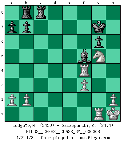 Last move : 1/2-1/2 2022 March 15 6:25:26 [Event "FICGS__CHESS__CLASS_GM__000008"] [Site "FICGS"] [Date "2021.10.09"] [Round "1"] [White "Ludgate,Alan"] [Black "Szczepanski,Zbigniew"] [Result "1/2-1/2"] [WhiteElo "2459"] [BlackElo "2474"] 1.d4 Nf6 2.c4 e6 3.Nc3 Bb4 4.Qc2 O-O 5.e4 d5 6.e5 Ne4 7.Bd3 c5 8.Nge2 cxd4 9.Nxd4 Nd7 10.Bf4 Qh4 11.g3 Qh5 12.O-O g5 13.cxd5 gxf4 14.dxe6 fxe6 15.Nxe4 Nxe5 16.f3 fxg3 17.Nxg3 Qh6 18.Be4 Qd2 19.Qxd2 Bxd2 20.Kh1 Ng6 21.Nb5 e5 22.Nc7 Rb8 23.Nd5 Kh8 24.Bxg6 hxg6 25.Rad1 Bf4 26.Nxf4 exf4 27.Ne4 Bh3 28.Rg1 Kg7 29.Ng5 Bf5 30.Rd4 Rfc8 31.Rxf4 1/2-1/2 Nimzo-Indian : Classical variation Kingside Castling by player Black (move 4) Kingside Castling by player White (move 12) This chess game ended in a draw. Follow this game move after move (download)Chess is everything: art, science and sport. (Anatoly Karpov) Die Leute spielen gegen mich seit 15 Jahren unter Ihren Möglichkeiten. (Robert James Fischer) Fischer es el jugador mas fuerte del mundo. De hecho, el jugador mas fuerte que jamas haya existido. (Larry Evans) J'ai toujours senti une vague pitié pour l'homme qui ne connaît rien aux échecs, tout comme j'en aurais pour un homme ignorant de l'amour. Les Echecs, comme la musique ou comme l'amour, ont le pouvoir de rendre heureux. (Siegbert Tarrasch) Live, lose, and learn, by observing your opponent how to win. (Amber Steenbock)