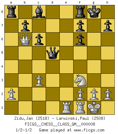 Last move : 1/2-1/2 2021 November 6 15:40:43 [Event "FICGS__CHESS__CLASS_GM__000008"] [Site "FICGS"] [Date "2021.10.09"] [Round "1"] [White "Zidu,Jan"] [Black "Larwinski,Paul"] [Result "1/2-1/2"] [WhiteElo "2518"] [BlackElo "2508"] 1.e4 e5 2.Nf3 Nc6 3.Bc4 Bc5 4.b4 Bxb4 5.c3 Ba5 6.d4 d6 7.Qb3 Qd7 8.O-O Bb6 9.Nbd2 Na5 10.Qc2 Nxc4 11.Nxc4 Qc6 12.Nxb6 axb6 13.dxe5 dxe5 14.Nxe5 Qa4 15.Qd3 Nf6 16.Bg5 Qxe4 17.Qb5+ c6 18.Qxb6 O-O 19.Bxf6 gxf6 20.Rae1 Qd5 21.Nf3 1/2-1/2 Evans gambit : Tartakower attack Kingside Castling by player White (move 8) Kingside Castling by player Black (move 18) This chess game ended in a draw. Follow this game move after move (download)In Chess, at least, the brave inherit the earth. (Edmar Mednis) Ein unbeabsichtigtes Patt ist der Gipfel der Dummheit. (Anonymous) El poder defensivo de una pieza clavada, solamente es imaginario. (Aaron Nimzovich) Les Echecs, c'est l'art de la guerre sans les charniers, c'est la résurrection des morts tombés au champ d'honneur, l'espoir perpétuel, la suprématie de l'intelligence sur la force, la culture de l'esprit. (F. Szpiner) They say poker is a zero-sum game. It must be, because every time I play my sum ends up zero. (Max Shapiro)