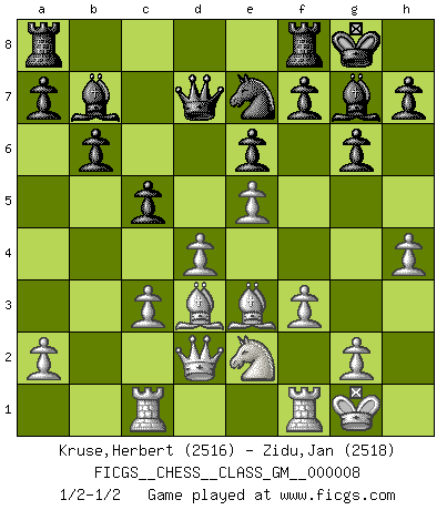 Last move : 1/2-1/2 2022 January 13 0:28:18 [Event "FICGS__CHESS__CLASS_GM__000008"] [Site "FICGS"] [Date "2021.10.09"] [Round "1"] [White "Kruse,Herbert"] [Black "Zidu,Jan"] [Result "1/2-1/2"] [WhiteElo "2516"] [BlackElo "2518"] 1.d4 Nf6 2.c4 g6 3.Nc3 d5 4.cxd5 Nxd5 5.e4 Nxc3 6.bxc3 Bg7 7.Bc4 c5 8.Ne2 Nc6 9.Be3 O-O 10.O-O b6 11.Rc1 e6 12.Bb5 Bd7 13.Bd3 Bc8 14.Bb5 Bd7 15.Bd3 Bc8 16.e5 Bb7 17.Qd2 Qd7 18.f3 Ne7 19.h4 1/2-1/2 King's Indian defense, 3.Nc3 Kingside Castling by player Black (move 9) Kingside Castling by player White (move 10) This chess game ended in a draw. Follow this game move after move (download)As one by one I mowed them down, my superiority soon became apparent. (Jose Capablanca) Ihnen, Herr Lasker, habe ich nur drei Worte zu sagen: Schach und matt. (Siegbert Tarrasch) Tu eres para mi la Reina en d8 y yo soy el Peón en d7!!. (GM Eduard Gufeld) On n'a jamais que l'âge auquel on a commence à jouer aux échecs car après on cesse de vieillir. (Capablanca) Men should grow up. - Yeah. And dogs should stop licking themselves. It's not gonna happen. (Gregory House to Dr. Cameron, House M.D.)