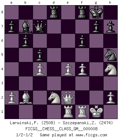 Last move : 1/2-1/2 2021 October 17 7:44:8 [Event "FICGS__CHESS__CLASS_GM__000008"] [Site "FICGS"] [Date "2021.10.09"] [Round "1"] [White "Larwinski,Paul"] [Black "Szczepanski,Zbigniew"] [Result "1/2-1/2"] [WhiteElo "2508"] [BlackElo "2474"] 1.e4 e5 2.Nf3 Nc6 3.Bc4 Bc5 4.b4 Bxb4 5.c3 Be7 6.d4 Na5 7.Bd3 d6 8.dxe5 dxe5 9.Nxe5 Nf6 10.O-O O-O 11.Qc2 c5 12.Nd2 Qc7 13.f4 b6 14.c4 Nh5 15.g3 f6 16.Nef3 Nc6 17.Bb2 Nb4 18.Qb3 Bb7 19.Rae1 Nxd3 20.Qxd3 Rad8 21.Qe2 Bd6 22.Nh4 Bxf4 23.gxf4 1/2-1/2 Evans gambit : Cordel variation Kingside Castling by player White (move 10) Kingside Castling by player Black (move 10) This chess game ended in a draw. Follow this game move after move (download)I give 98 percent of my mental energy to Chess. Others give only 2 percent. (Bobby Fischer) Alles was am Schachbrett zählt sind gute Züge. (Robert James Fischer) El arma más poderosa en el Ajedrez, es tener la próxima movida. (David Bronstein) Mais n'est-ce pas déjà le limiter injurieusement que d'appeler les échecs un jeu? N'est-ce pas aussi une science, un art, ou quelque chose qui, comme le cercueil de Mahomet entre ciel et terre, est suspendu entre l'un et l'autre, et qui réunit un nombre incroyable de contraires ? (Stefan Zweig) Treat your password like your toothbrush. Don't let anybody else use it, and get a new one every six months. (Clifford Stoll)