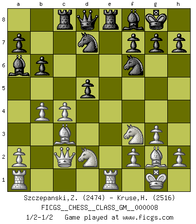 Last move : 1/2-1/2 2021 October 23 13:23:15 [Event "FICGS__CHESS__CLASS_GM__000008"] [Site "FICGS"] [Date "2021.10.09"] [Round "1"] [White "Szczepanski,Zbigniew"] [Black "Kruse,Herbert"] [Result "1/2-1/2"] [WhiteElo "2474"] [BlackElo "2516"] 1.d4 Nf6 2.c4 e6 3.Nf3 b6 4.g3 Ba6 5.b3 Bb4+ 6.Bd2 Be7 7.Bg2 c6 8.Bc3 d5 9.Nbd2 Nbd7 10.Qc2 O-O 11.e4 c5 12.exd5 exd5 13.O-O Rc8 14.Rfe1 Re8 15.dxc5 Bxc5 16.b4 Bf8 1/2-1/2 Queen's Indian : Nimzovich variation (exaggerated Fianchetto) Kingside Castling by player Black (move 10) Kingside Castling by player White (move 13) This chess game ended in a draw. Follow this game move after move (download)That's what Chess is all about. One day you give your opponent a lesson, the next day he gives you one. (Bobby Fischer) Karpov ist ein Museumsstück. (Garry Kasparov) Desconfianza es la característica mas necesaria de un jugador de Ajedrez. (Siegbert Tarrasch) Nous vivons dans un monde échiquéen : chaque jour qui passe est un défi à relever. (Philosophe Sasha) Art disturbs, science reassures. (Georges Braque, Le Jour et la Nuit)