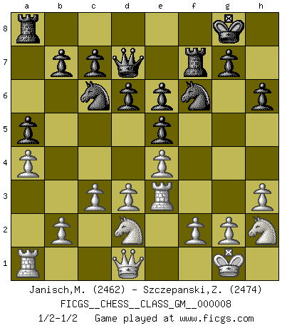 Last move : 1/2-1/2 2021 October 14 18:13:0 [Event "FICGS__CHESS__CLASS_GM__000008"] [Site "FICGS"] [Date "2021.10.09"] [Round "1"] [White "Janisch,Manfred"] [Black "Szczepanski,Zbigniew"] [Result "1/2-1/2"] [WhiteElo "2462"] [BlackElo "2474"] 1.e4 e5 2.Nf3 Nc6 3.Bc4 Bc5 4.c3 Nf6 5.d3 d6 6.O-O O-O 7.h3 a6 8.Re1 h6 9.a4 a5 10.Nbd2 Be6 11.Bxe6 fxe6 12.Nb3 Bb6 13.Be3 Bxe3 14.Rxe3 Qd7 15.Nbd2 Rf7 16.Nh2 1/2-1/2 Giuoco Piano Kingside Castling by player White (move 6) Kingside Castling by player Black (move 6) This chess game ended in a draw. Follow this game move after move (download)I'm not afraid of Spassky. The world knows I'm the best. You don't need a match to prove it. (Bobby Fischer) Zeige mir drei Eröffnungsvarianten und ich beweise dir, dass zwei davon inkorrekt sind. (Emanuel Lasker) Jugadores de primera clase pierden en contra de jugadores de segunda clase porque los jugadores de segunda clase a veces juegan una partida de primer clase. (Siegbert Tarrasch) Les réformistes prétendent que les progrès de la théorie conduiront à la disparition des échecs, et qu'il faut, pour leur rendre vie, en remanier les règles. En réalité, qu'exprime cette affirmation? Le mépris de l'intuition, de l'imagination et de tous les autres éléments qui font des échecs un art. (Alexander Alekhine) You lose, general Kenobi. (General Grievous in Star Wars ep.3)