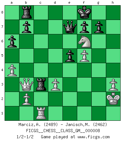 Last move : 1/2-1/2 2021 December 23 16:36:57 [Event "FICGS__CHESS__CLASS_GM__000008"] [Site "FICGS"] [Date "2021.10.09"] [Round "1"] [White "Marciz,Alexander"] [Black "Janisch,Manfred"] [Result "1/2-1/2"] [WhiteElo "2489"] [BlackElo "2462"] 1.e4 c5 2.Nc3 d6 3.Nge2 a6 4.g3 e5 5.d3 Nf6 6.a4 Be7 7.Bg2 O-O 8.O-O Bd7 9.f4 Nc6 10.h3 h6 11.Be3 Rb8 12.f5 Nb4 13.g4 Bc6 14.g5 hxg5 15.Bxg5 d5 16.Bxf6 Bxf6 17.exd5 Nxd5 18.Nxd5 Bxd5 19.Ng3 c4 20.Bxd5 Qxd5 21.Ne4 Qc6 22.Ra3 cxd3 23.cxd3 Rfc8 24.Kh2 Kf8 25.Rc3 Qd7 26.Qb3 Rc6 27.Rfc1 Rxc3 28.Nxf6 Qe7 1/2-1/2 Sicilian : Closed Kingside Castling by player Black (move 7) Kingside Castling by player White (move 8) This chess game ended in a draw. Follow this game move after move (download)My God, Bobby Fischer plays so simply. (Alexei Suetin) Wenn ich mich einlogge, glauben die Leute gewöhnlich nicht, dass ich es selbst bin und sie fangen an, mir dumme Fragen zu stellen. Und wenn sie es glauben, stellen sie wieder andere dumme Fragen. (Judith Polgar) Yo no le temo a Spassky. Todos saben que yo soy el mejor. Uno no necesita un torneo para probarlo. (Bobby Fischer) Le profane ne songe pas à la somme de jouissance dont il se prive, qui méconnaît ce jeu aux ressources aussi variées que passionnantes. (Jean-Marie Jeanton-Lamarche) To be champion requires more than simply being a strong player; one has to be a strong human being as well. (Anatoly Karpov)
