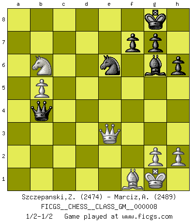 Last move : 1/2-1/2 2021 November 7 12:41:27 [Event "FICGS__CHESS__CLASS_GM__000008"] [Site "FICGS"] [Date "2021.10.09"] [Round "1"] [White "Szczepanski,Zbigniew"] [Black "Marciz,Alexander"] [Result "1/2-1/2"] [WhiteElo "2474"] [BlackElo "2489"] 1.d4 d5 2.c4 dxc4 3.e4 e5 4.Nf3 Bb4+ 5.Nc3 Nf6 6.Nxe5 b5 7.f3 a6 8.Be2 O-O 9.a3 Ba5 10.O-O Re8 11.Be3 Bb7 12.a4 c6 13.Bf2 Nbd7 14.Nxd7 Nxd7 15.Qc2 Bb6 16.Rfd1 Nf8 17.Bf1 Re7 18.axb5 axb5 19.Rxa8 Bxa8 20.d5 cxd5 21.Nxb5 Bxf2+ 22.Qxf2 Qe8 23.Nc3 dxe4 24.fxe4 Bxe4 25.Bxc4 Bg6 26.b4 h6 27.Bf1 Rd7 28.Rxd7 Qxd7 29.Qe3 Ne6 30.b5 Qd6 31.Na4 Qb4 32.Nb6 1/2-1/2 QGA : 3.e4 Kingside Castling by player Black (move 8) Kingside Castling by player White (move 10) This chess game ended in a draw. Follow this game move after move (download)The tactician knows what to do when there is something to do; whereas the strategian knows what to do when there is nothing to do. (Gerald Abrahams) Wie gewinnt Tal? Er entwickelt alle seine Figuren in die Brettmitte und opfert sie dann irgendwo. (Robert James Fischer) Tu sabes que vas a perder. Aún cuando tenía la ventaja, yo sabía que iba a perder. - al estar jugando con Fischer (Andrew Soltis) Les Echecs ont trois composantes : le temps, l'espace et le matériel en dernier. (Mikhail Tal) Sometimes it pays to stay in bed in Monday, rather than spending the rest of the week debugging Monday's code. (Dan Salomon)