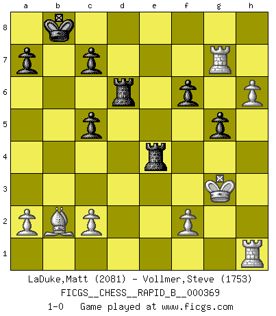 Last move : 1-0 2021 November 28 12:48:16 [Event "FICGS__CHESS__RAPID_B__000369"] [Site "FICGS"] [Date "2021.10.17"] [Round "1"] [White "LaDuke,Matt"] [Black "Vollmer,Steve"] [Result "1-0"] [WhiteElo "2081"] [BlackElo "1753"] 1.e4 e5 2.Nf3 Nf6 3.Nxe5 d6 4.Nf3 Nxe4 5.d4 Bg4 6.h3 Bh5 7.Qd3 Qe7 8.Be2 Nc6 9.Qb5 Bxf3 10.gxf3 O-O-O 11.Qf5+ Kb8 12.Qxe4 Qxe4 13.fxe4 Nxd4 14.Bd3 d5 15.exd5 Rxd5 16.Nc3 Bb4 17.Kf1 Bxc3 18.bxc3 Nf3 19.c4 Rd6 20.Bb2 f6 21.Kg2 Nh4+ 22.Kg3 Ng6 23.Rae1 b6 24.h4 Rhd8 25.h5 Nf8 26.Re7 g5 27.Bxh7 Nxh7 28.Rxh7 Re8 29.h6 Re4 30.c5 bxc5 31.Rg7 1-0 Petrov : Classical attack Queenside Castling by player Black (move 10) Player White won this chess game. Follow this game move after move (download)Who is your opponent tonight, tonight I am playing against the Black pieces. (Akiba Rubinstein) Schon mancher Spieler hat aufgegeben, um zu vermeiden, daß er eine Figur verliert. (Savielly Grigorievitsch Tartakower) El jugador táctico sabe que hacer cuando hay algo que hacer; mientras que el estratega sabe que hacer cuando no hay nada que hacer. (Gerald Abrahams) Vouloir jouer aux échecs contre soi-même est aussi paradoxal que vouloir marcher sur son ombre. (Stefan Zweig) The obstacle is the path. (Zen proverb)