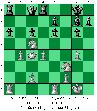 Last move : 1-0 2022 January 4 8:59:12 [Event "FICGS__CHESS__RAPID_B__000369"] [Site "FICGS"] [Date "2021.10.17"] [Round "1"] [White "LaDuke,Matt"] [Black "Trigance,Emile"] [Result "1-0"] [WhiteElo "2081"] [BlackElo "1776"] 1.e4 c5 2.Nf3 Nc6 3.Bb5 g6 4.O-O Bg7 5.Bxc6 dxc6 6.d3 Nf6 7.Re1 O-O 8.a4 b6 9.a5 a6 10.axb6 Qxb6 11.h3 Ne8 12.Nc3 Nd6 13.Na4 Qd8 14.Be3 Rb8 15.Bxc5 Nb5 16.d4 Nd6 17.e5 Ne8 18.Qd3 Nc7 19.Bb6 Be6 20.Bxc7 Qxc7 21.Nc5 Qc8 22.b3 Bf5 23.Qc4 Ra8 24.b4 Rd8 25.e6 fxe6 26.g4 Bxg4 27.hxg4 1-0 Sicilian : Nimzovich-Rossolimo attack (with ...g6, without ...d6) Kingside Castling by player White (move 4) Kingside Castling by player Black (move 7) Player White won this chess game. Follow this game move after move (download)On the chessboard, lies and hypocrisy do not survive long. (Emanuel Lasker) Ich verstehe Aljechins Kombinationen ganz gut; aber woher er diese Angriffschancen bekommt und wie er die Eröffnung behandelt das ist für mich ein Buch mit sieben Siegeln. (Rudolf Spielmann) No solamente yo pronostico su triunfo sobre Botvinnik, sino que me adelanto y digo que probablemente Fischer es el jugador de Ajedrez mas grande que haya existido. (John Collins) Toute estimation doit être constamment réévaluée. (Jacob Estrin) In theory there is no difference between theory and practice. In practice there is. (Yogi Berra)