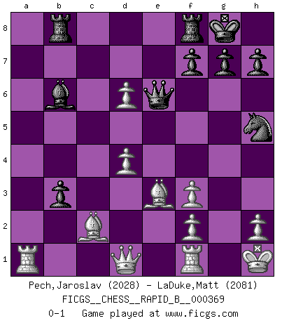 Last move : 0-1 2021 December 19 5:52:58 [Event "FICGS__CHESS__RAPID_B__000369"] [Site "FICGS"] [Date "2021.10.17"] [Round "1"] [White "Pech,Jaroslav"] [Black "LaDuke,Matt"] [Result "0-1"] [WhiteElo "2028"] [BlackElo "2081"] 1.e4 e5 2.Nf3 Nc6 3.Bb5 a6 4.Ba4 Nf6 5.O-O Bc5 6.c3 b5 7.Bb3 d6 8.d4 Bb6 9.a4 Rb8 10.axb5 axb5 11.Na3 Bg4 12.Nxb5 O-O 13.Bc2 exd4 14.Nbxd4 Nxd4 15.cxd4 Bxf3 16.gxf3 Nh5 17.Kh1 Qf6 18.Be3 c5 19.e5 Qe6 20.exd6 c4 21.b3 cxb3 0-1 Ruy Lopez : Moeller defense Kingside Castling by player White (move 5) Kingside Castling by player Black (move 12) Player Black won this chess game. Follow this game move after move (download)The only thing Chess players have in common is Chess. (Lodewijk Prins) Garry Kasparov war erst in der Großmeister-Organisation GMA, dann in der Profischach-Vereinigung PCA, zum Schluss kehrte er wieder in den Schoß der FIDE zurück. Aber gut, manche Leute sind flexibel (Viswanathan Anand) A través de las casillas del tablero, los Indios explican el movimiento del tiempo y la edad, las influencias mas altas que controlan el mundo y los lazos que vinculan al Ajedrez con el alma humana. (Al-Masudi) Les Echecs, c'est l'art de la guerre sans les charniers, c'est la résurrection des morts tombés au champ d'honneur, l'espoir perpétuel, la suprématie de l'intelligence sur la force, la culture de l'esprit. (F. Szpiner) Those who make the worst use of their time are the first to complain of its brevity. (Jean de la Bruyere)