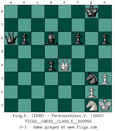 Last move : 0-1 2007 September 21 23:5:39 [Event "FICGS__CHESS__CLASS_E__000055"] [Site "FICGS"] [Date "2007.07.21"] [Round "1"] [White "King,Kevin"] [Black "Perevozchikov,Vjacheslav"] [Result "0-1"] [WhiteElo "1548"] [BlackElo "1600"] 1.e4 b6 2.d4 Bb7 3.Nc3 e6 4.a3 Nf6 5.Bd3 c5 6.Nf3 cxd4 7.Nxd4 d6 8.O-O Be7 9.f4 O-O 10.f5 e5 11.Nde2 Nbd7 12.Ng3 d5 13.Qe1 Bc5+ 14.Kh1 d4 15.Nce2 a5 16.Ng1 h6 17.Bd2 Bd6 18.Nh3 Nc5 19.Nf2 Rc8 20.Rc1 Qd7 21.Qe2 Nxd3 22.cxd3 Rxc1 23.Rxc1 Rc8 24.Qd1 Rxc1 25.Qxc1 Qb5 26.Qc2 Ba6 27.a4 Qc5 28.Qb3 Nd7 29.Qd1 Qc6 30.Ne2 Nc5 31.Qc1 Qxa4 32.Bxh6 Bf8 33.Qg5 f6 34.Qg3 Bxd3 35.Nxd3 Qd1+ 36.Ng1 Qxd3 37.Qe1 gxh6 38.h3 Bd6 39.b4 Nxe4 40.bxa5 Ng3+ 41.Kh2 e4 42.a6 Nxf5 43.Kh1 Qxa6 44.Qxe4 Ng3+ 0-1 Owen defense Kingside Castling by player White (move 8) Kingside Castling by player Black (move 9) Player Black won this chess game. Follow this game move after move (download)We must make sure that Chess will not be like a dead language, very interesting, but for a very small group. (Sytze Faber) Ein guter Spieler hat immer Glück. (José Raúl Capablanca) El Ajedrez es una hermosa aventura. (Bent Larsen) Les échecs c'est le défi de l'alpiniste, toujours plus haut, prêt à tout pour monter à l'assaut du Roi ennemi. Les échecs, c'est de la musique en mouvement, un ballet majestueux pour les yeux. C'est de la poésie composée par les fantômes du passé qui au même titre que Rimbaud ou Verlaine méritent notre admiration. Les échecs, c'est de la peinture ou le moindre mouvement modifie le tableau pour en faire un Picasso ou un Van Gogh. Les échecs, c'est tout et rien, c'est la vie et la mort. Jjulie33 sur le forum de France-Echecs. See no evil, hear no evil, speak no evil. (The 3 monkeys)