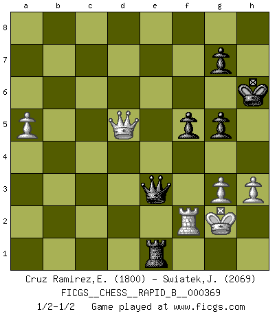 Last move : 1/2-1/2 2021 November 20 12:13:6 [Event "FICGS__CHESS__RAPID_B__000369"] [Site "FICGS"] [Date "2021.10.17"] [Round "1"] [White "Cruz Ramirez,Eliecer"] [Black "Swiatek,Janusz"] [Result "1/2-1/2"] [WhiteElo "1800"] [BlackElo "2069"] 1.Nf3 d5 2.g3 Nf6 3.Bg2 c6 4.O-O Bg4 5.h3 Bh5 6.c4 e6 7.d4 Nbd7 8.cxd5 exd5 9.Qb3 Qb6 10.Qe3+ Be7 11.Nh4 Bg6 12.Nc3 Qd8 13.Nxg6 hxg6 14.b4 b5 15.a4 a5 16.bxa5 b4 17.Na2 O-O 18.Bd2 Re8 19.Rfb1 c5 20.dxc5 Bxc5 21.Qd3 Ne5 22.Qc2 Ne4 23.Be1 Rc8 24.Qd1 Nc6 25.e3 d4 26.Bxe4 Rxe4 27.Nxb4 Qe8 28.Nxc6 dxe3 29.Ra2 Qe6 30.Rc2 Rxc6 31.Kh2 Kh7 32.Qf3 exf2 33.Bxf2 Bxf2 34.Rxf2 f5 35.R1b2 R6c4 36.Rbe2 Rxa4 37.Rxe4 Rxe4 38.Rd2 Re3 39.Qf2 g5 40.Qg2 Kh6 41.Qd5 Re2+ 42.Kh1 Re1+ 43.Kg2 Qe3 44.Rf2 1/2-1/2 Reti : King's Indian attack, Yugoslav variation Kingside Castling by player White (move 4) Kingside Castling by player Black (move 17) This chess game ended in a draw. Follow this game move after move (download)Is Bobby Fischer quite sane ? (Salo Flohr) Die Arbeit ist etwas Unnatürliches. Die Faulheit allein ist göttlich. (Anatole France) El Ajedrez tiene tanto misterio como las mujeres. (Purdy) La victoire dans une partie d'Echecs appartient la plupart du temps à celui qui voit un peu plus loin que l'adversaire. (Lasker) Wipe them out. All of them. (Darth Sidious in Star Wars ep.1)
